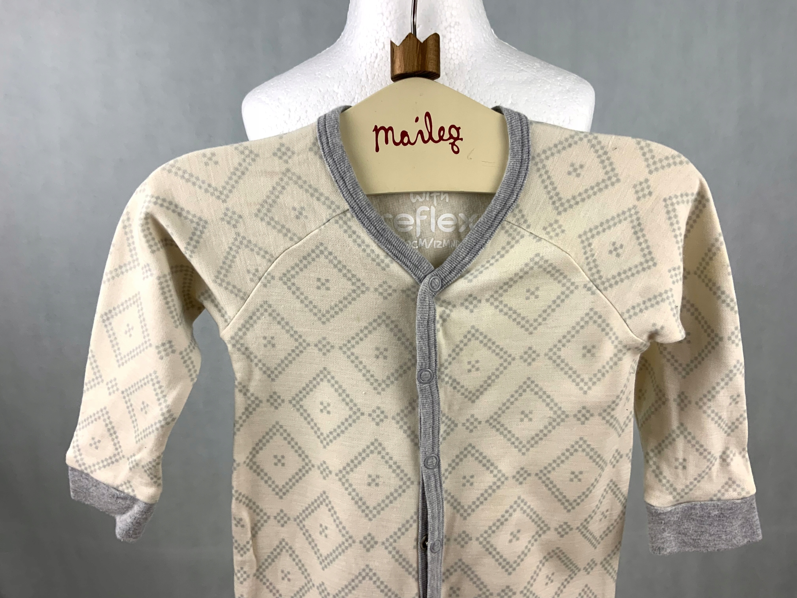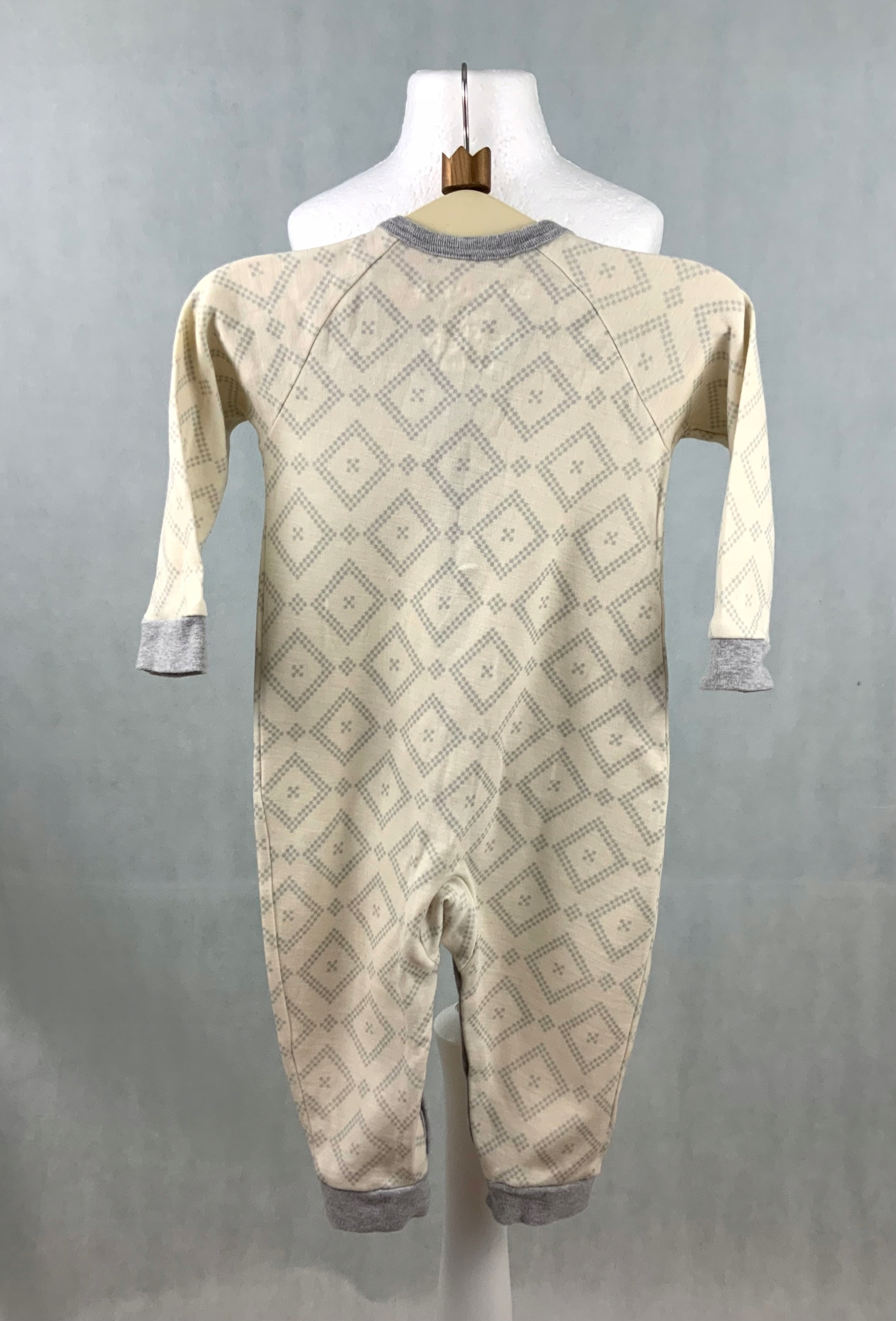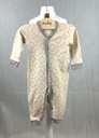 Dwuwarstwowy kombinezon rampers śmietankowy z szarym wzorem. Obydwie nogawki zapinane na napy do mankietów