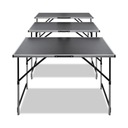 Łatwy do czyszczenia, czarny blat z MDF jest wspierany przez nogi żelazne oraz mocne, ale lekkie nogi aluminiowe, zapewniając stabilność całego zestawu. Stoły mogą utrzymać maksymalnie 30 kg i mają regulowaną wysokość: 73, 80, 87 i 94 cm.