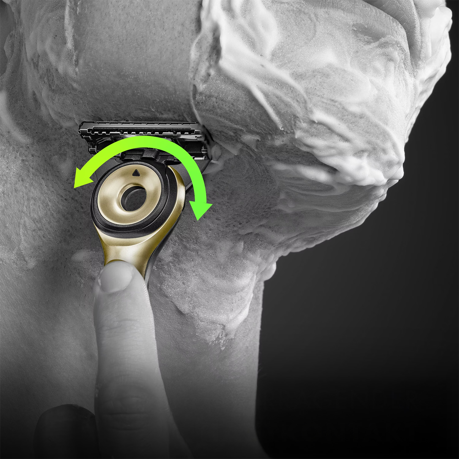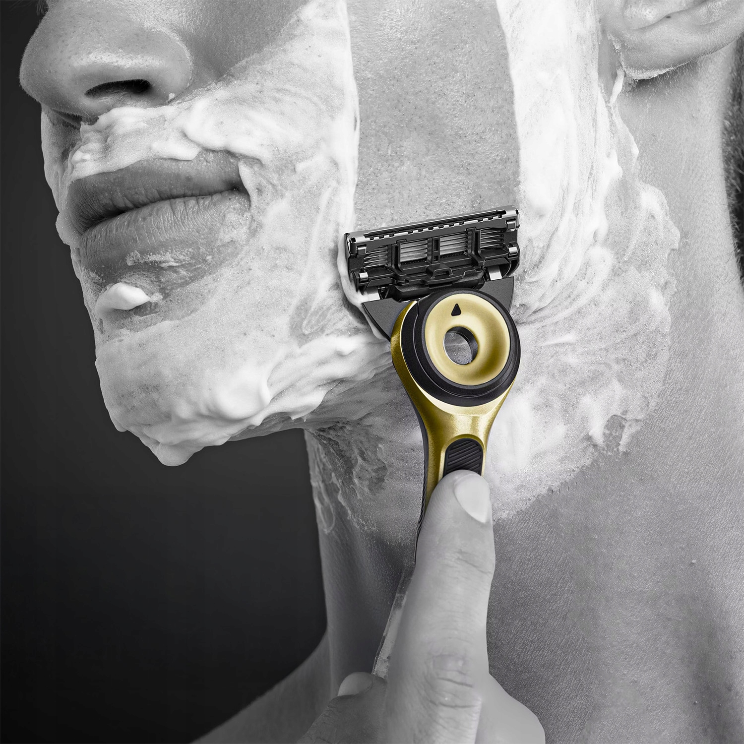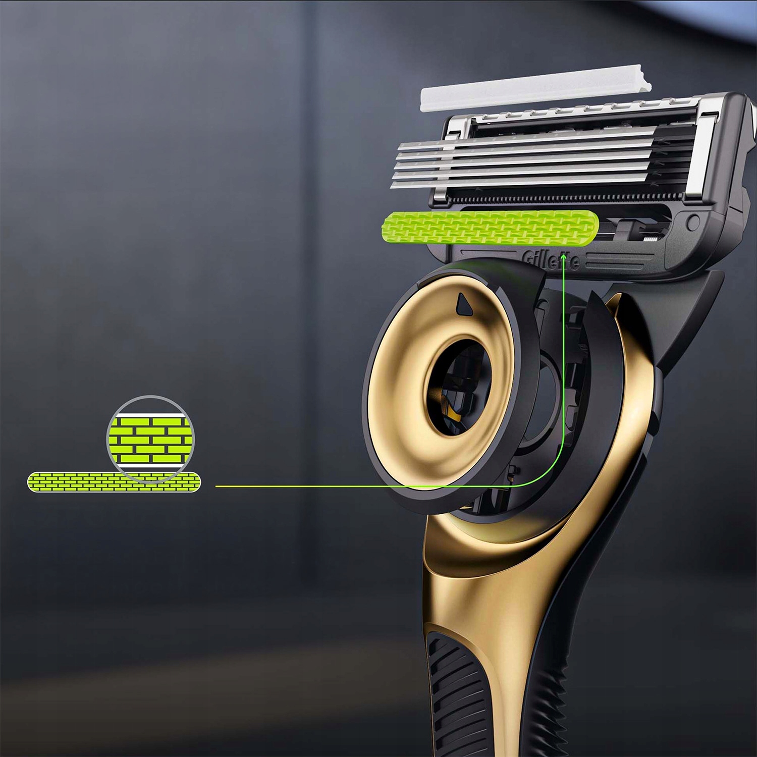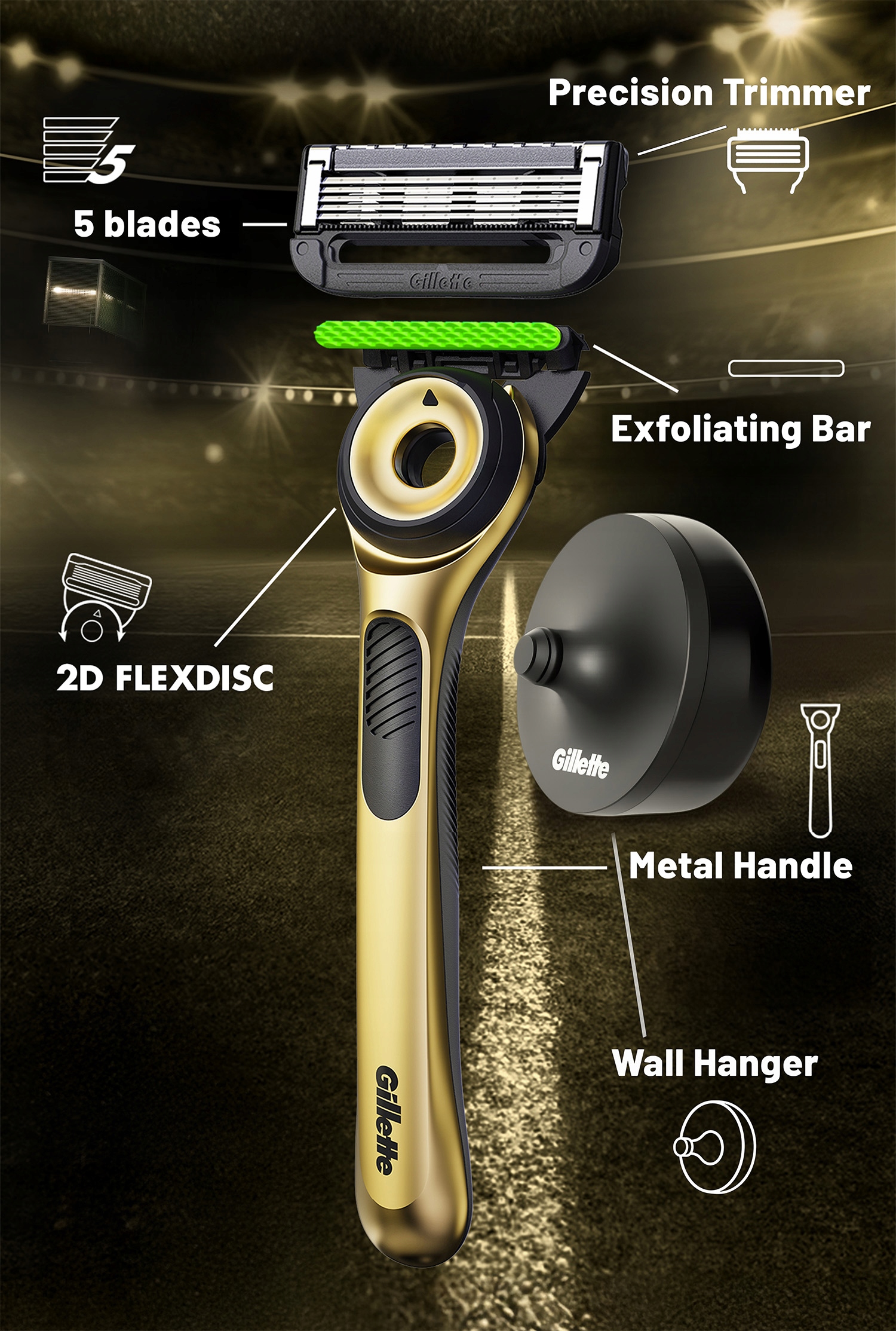 Gillette Labs Champion Gold Edition łączy 5 ostrzy, wbudowany trymer precyzyjny, pasek złuszczający Exfoliating Bar i technologię 2D FlexDisc dopasowującą się do twarzy. Złota metalowa konstrukcja oraz uchwyt ścienny 3M zapewniają wygodę i porządek w łazience.