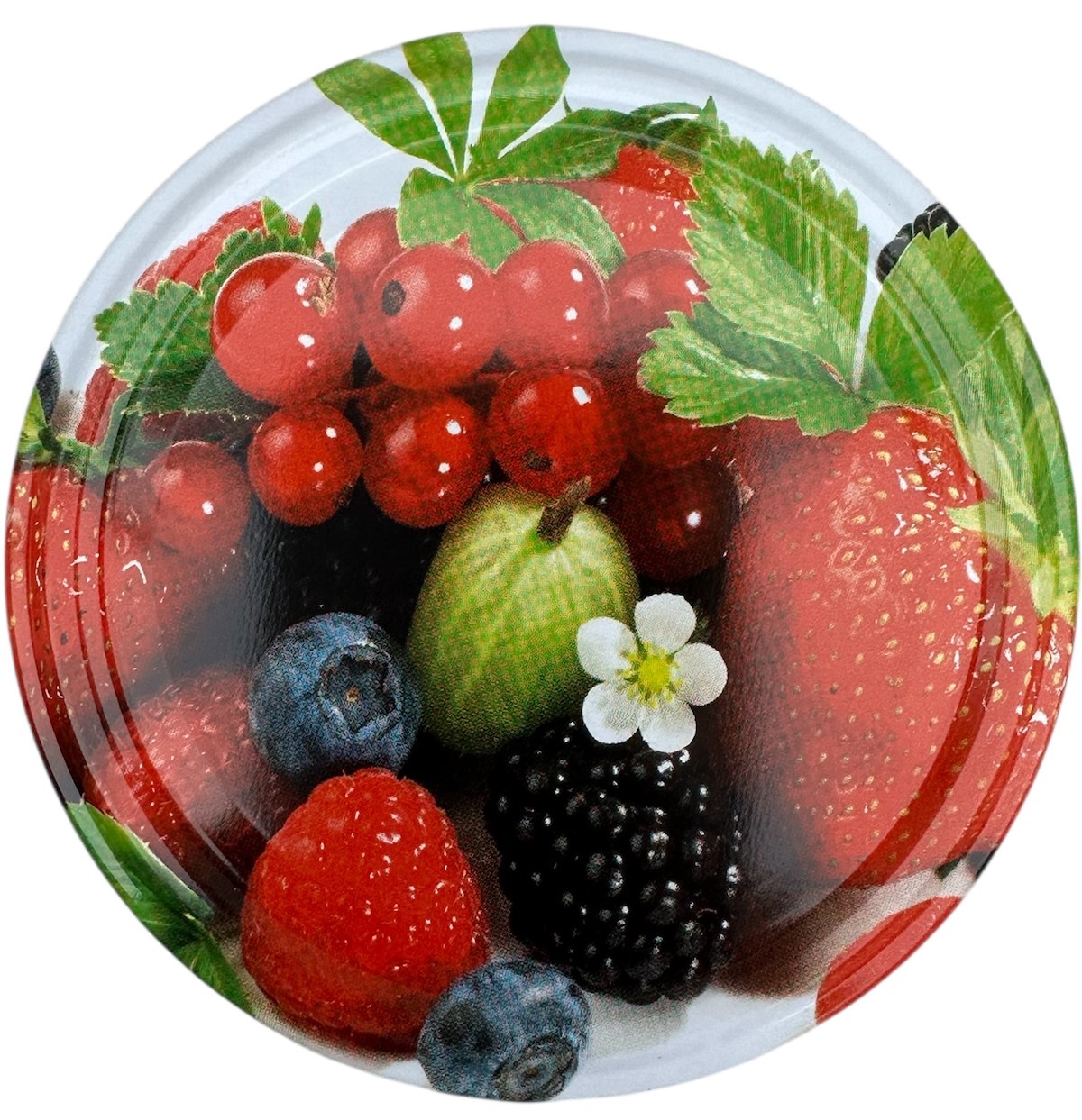 Przedmiotem aukcji jest komplet 50 sztuk wysokiej jakości zakrętek do słoików o średnicy 82 mm z 6 zaczepami, z efektownym nadrukiem przedstawiającym soczyste owoce (truskawki, czereśnie, porzeczki, gruszki, jabłka) oraz dekoracyjne kwiaty rumianku.