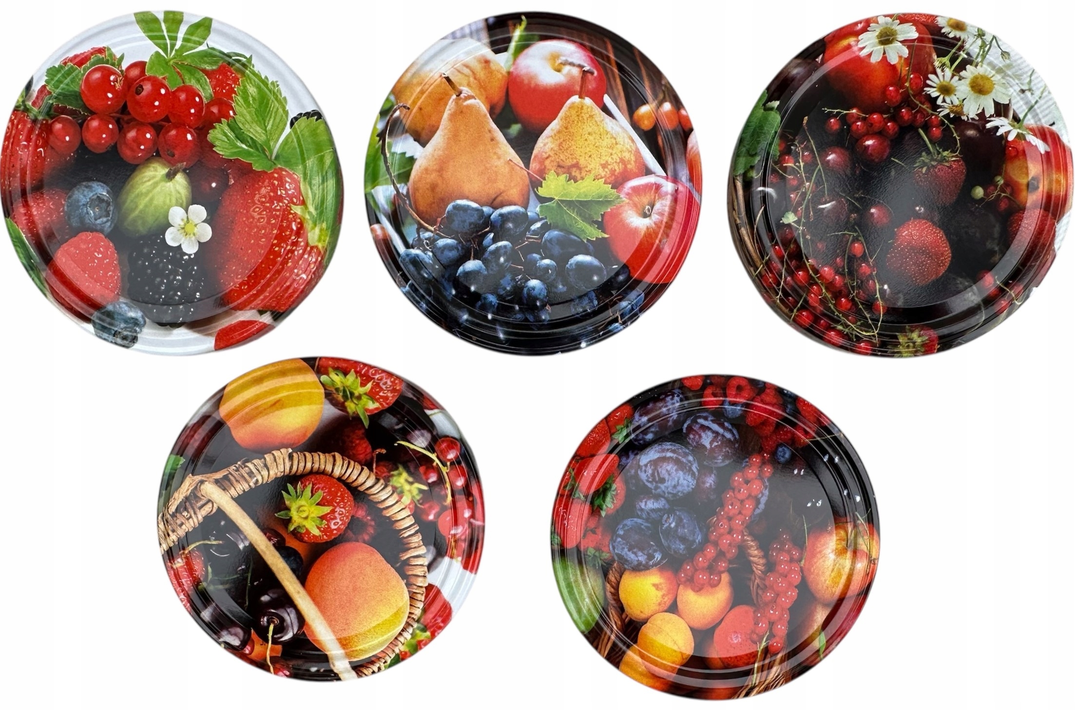 Zakrętki do słoików fi 82 mm na 6 zaczepów – 50 sztuk | Motyw owoce i kwiaty MIX