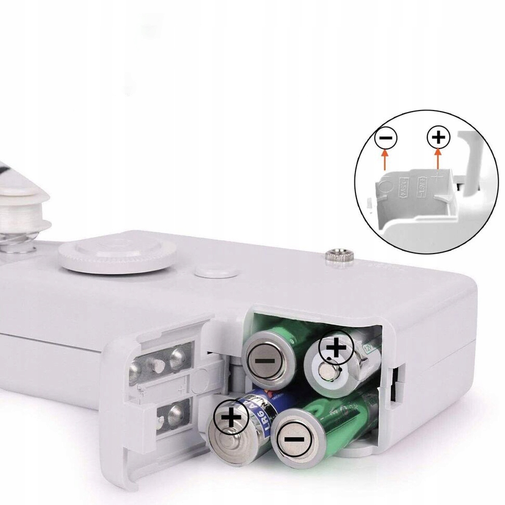Ta ręczna maszyna do szycia jest zasilana 4 bateriami AA (brak w zestawie) lub zasilaczem AC/DC 6 V 800 mA (brak w zestawie).