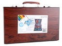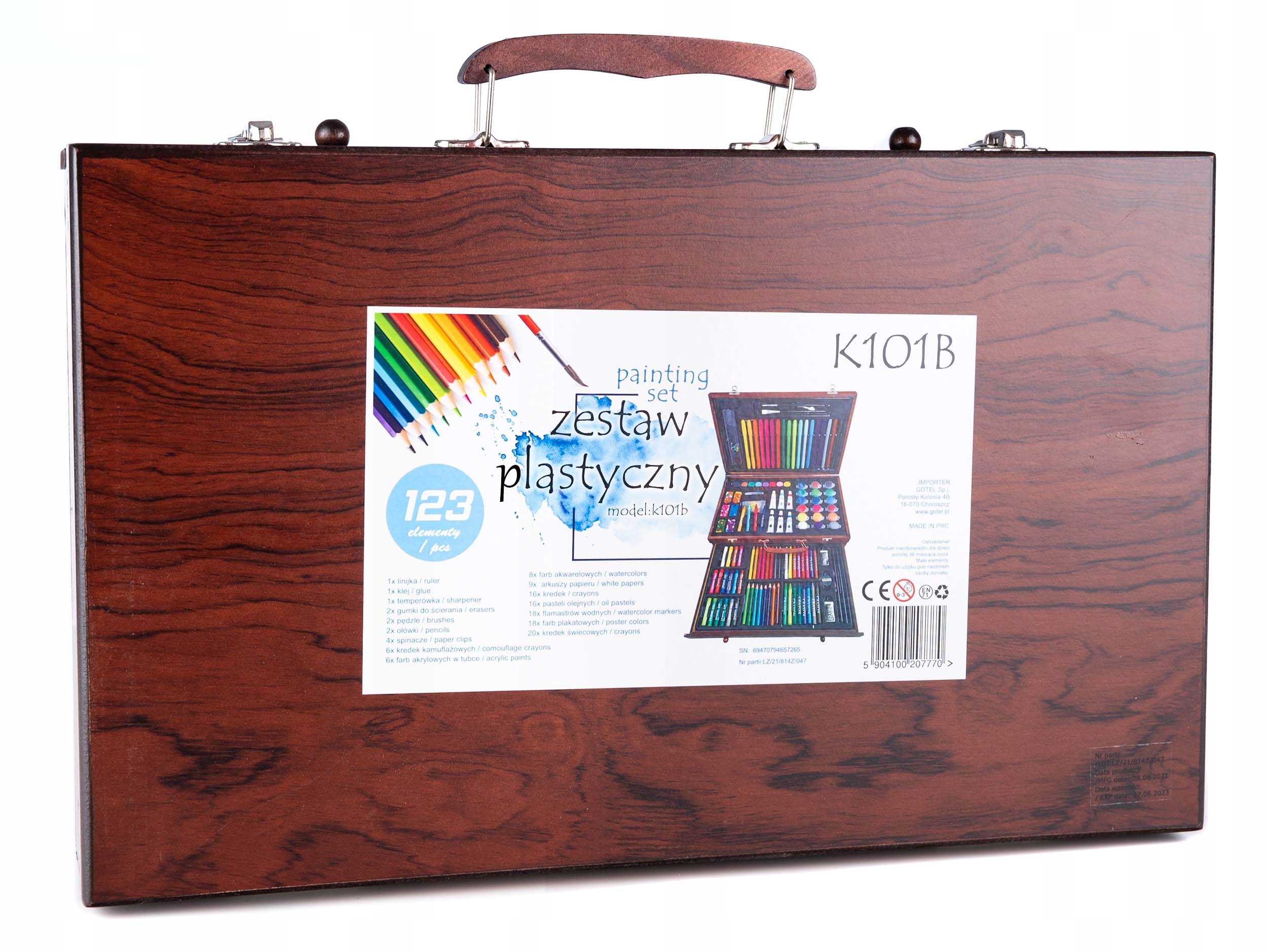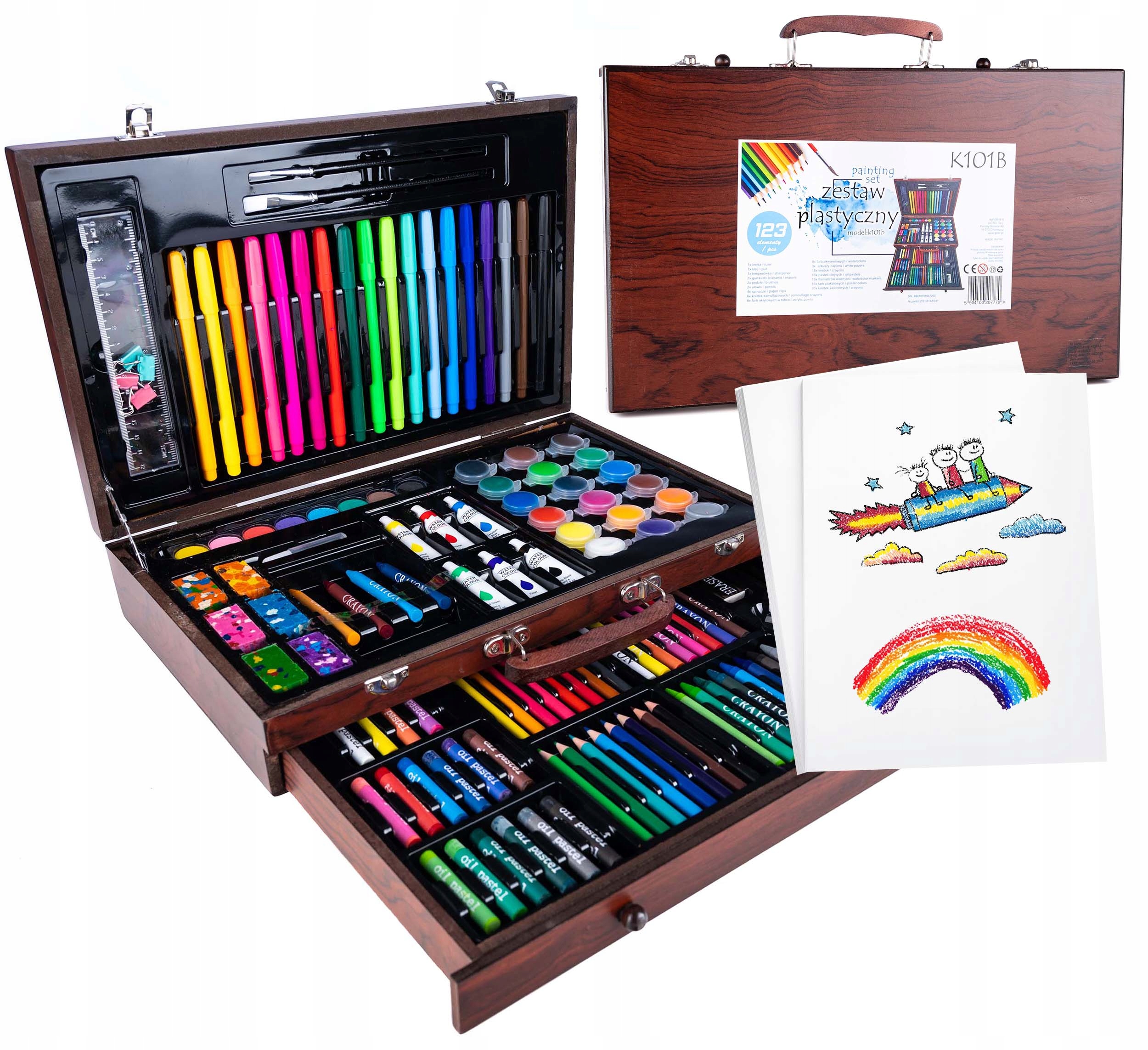 Zawiera szeroki wybór narzędzi plastycznych, takich jak kredki, farby, flamastry, pędzle, a także niezbędne akcesoria pomocnicze – wszystko zapakowane w elegancką, drewnianą walizkę.