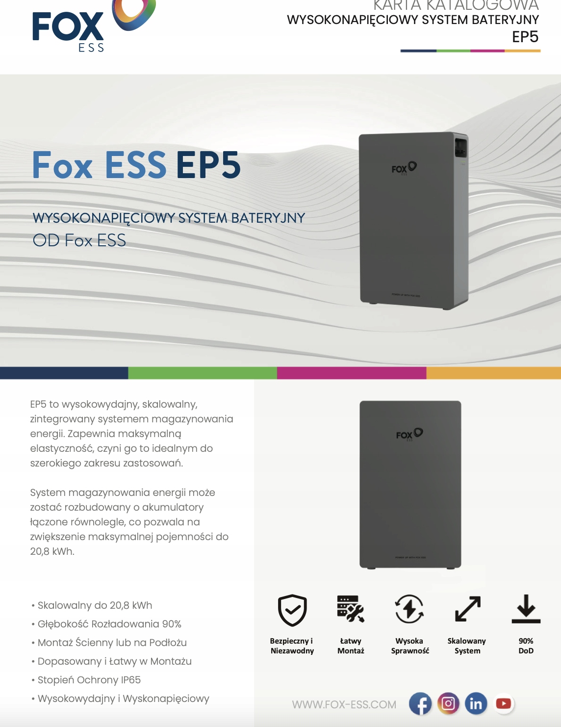 Magazyn energii FoxEss EP5 to nowoczesne rozwiązanie, które łączy w sobie wysoką wydajność, skalowalność i integrację z systemami magazynowania energii. Ten wysokonapięciowy system bateryjny zapewnia maksymalną elastyczność, co czyni go idealnym produktem do szerokiego zakresu zastosowań, zarówno domowych, jak i komercyjnych.