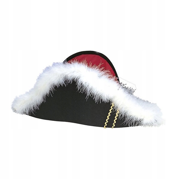 Zdobiony białymi piórami oraz złotymi tasiemkami.