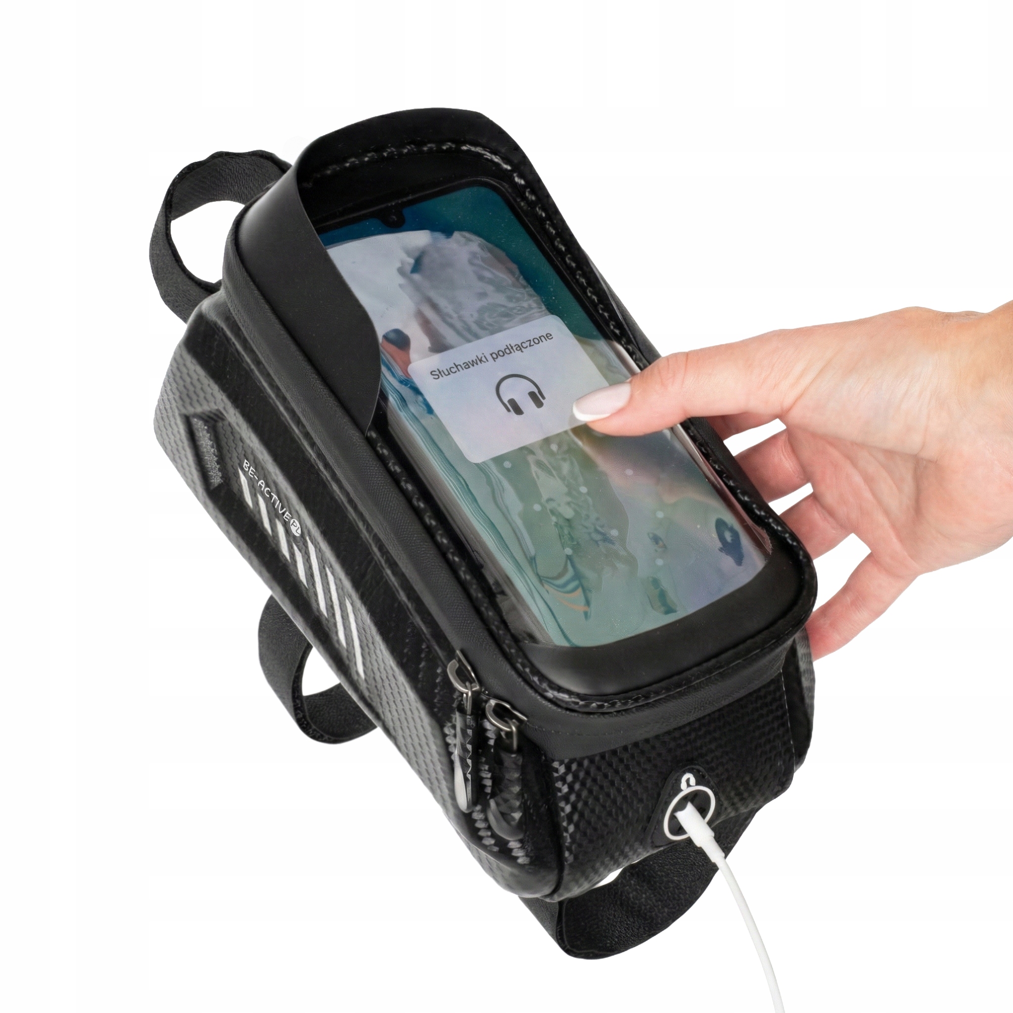 Górna część torby posiada przezroczyste okienko z folii reagującej na dotyk, które umożliwia obsługę telefonu bez wyjmowania go z pokrowca.