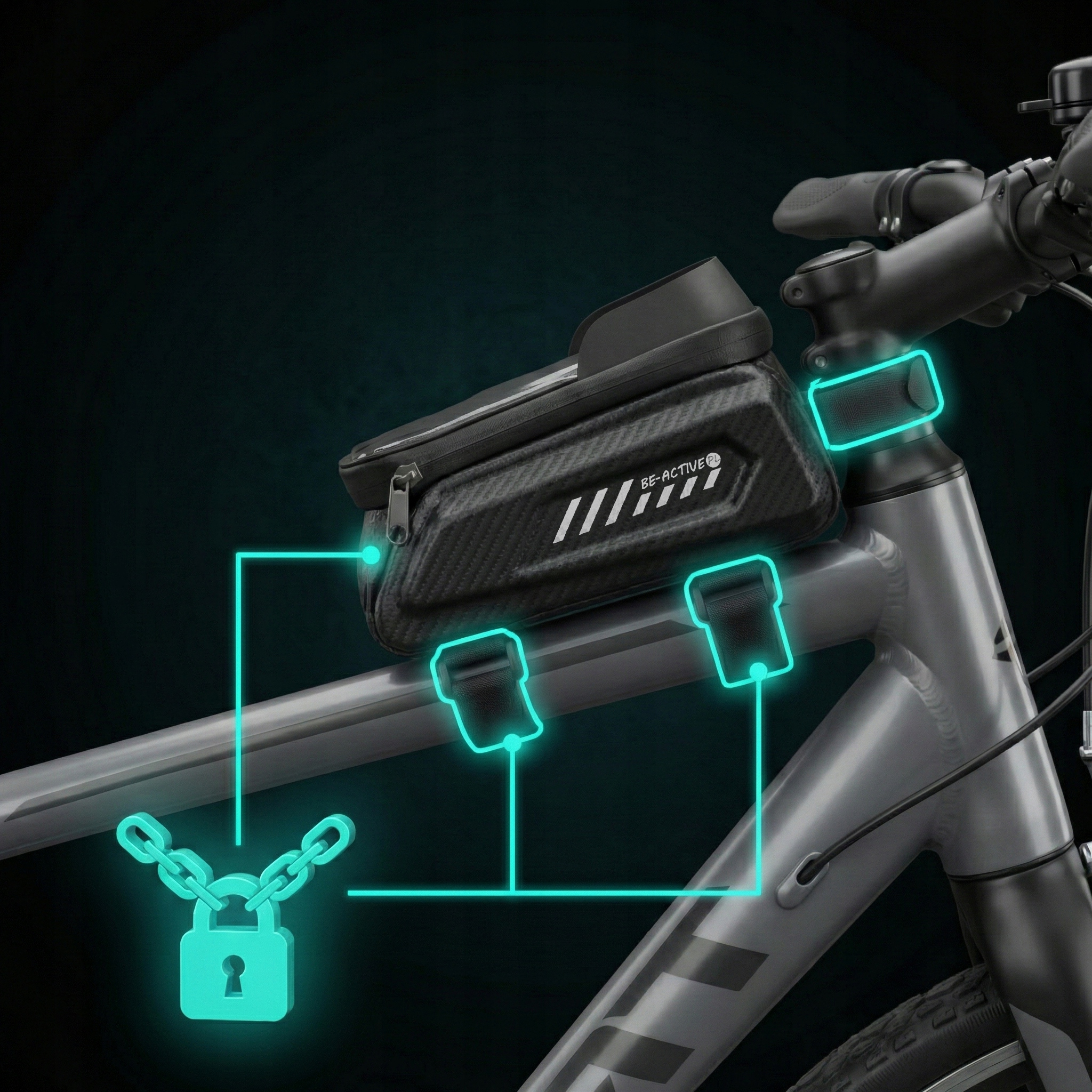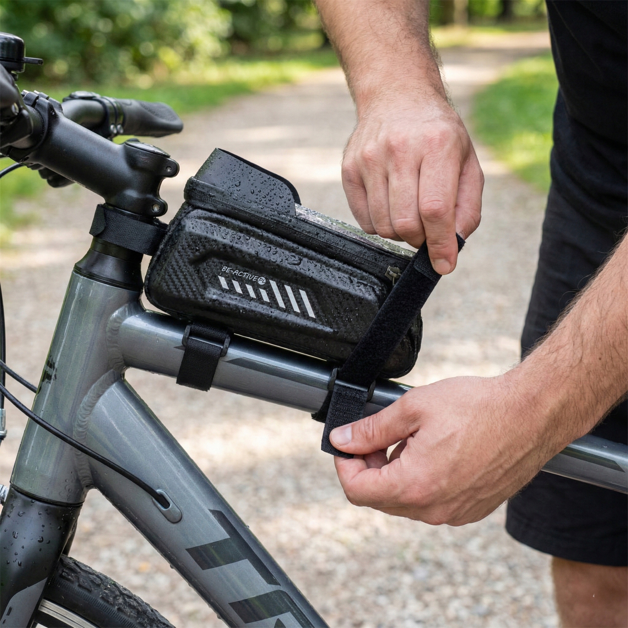 Trzy szerokie rzepy mocujące gwarantują solidne przyleganie do ramy, nawet przy nierównościach terenu czy szybkiej jeździe.