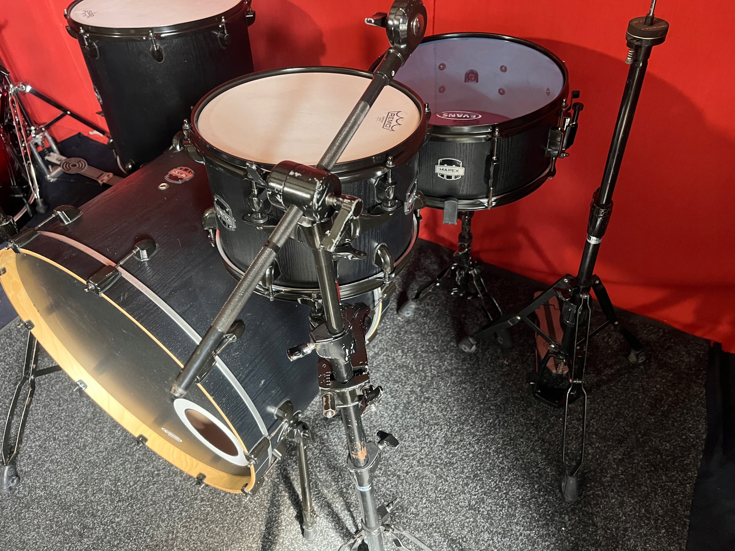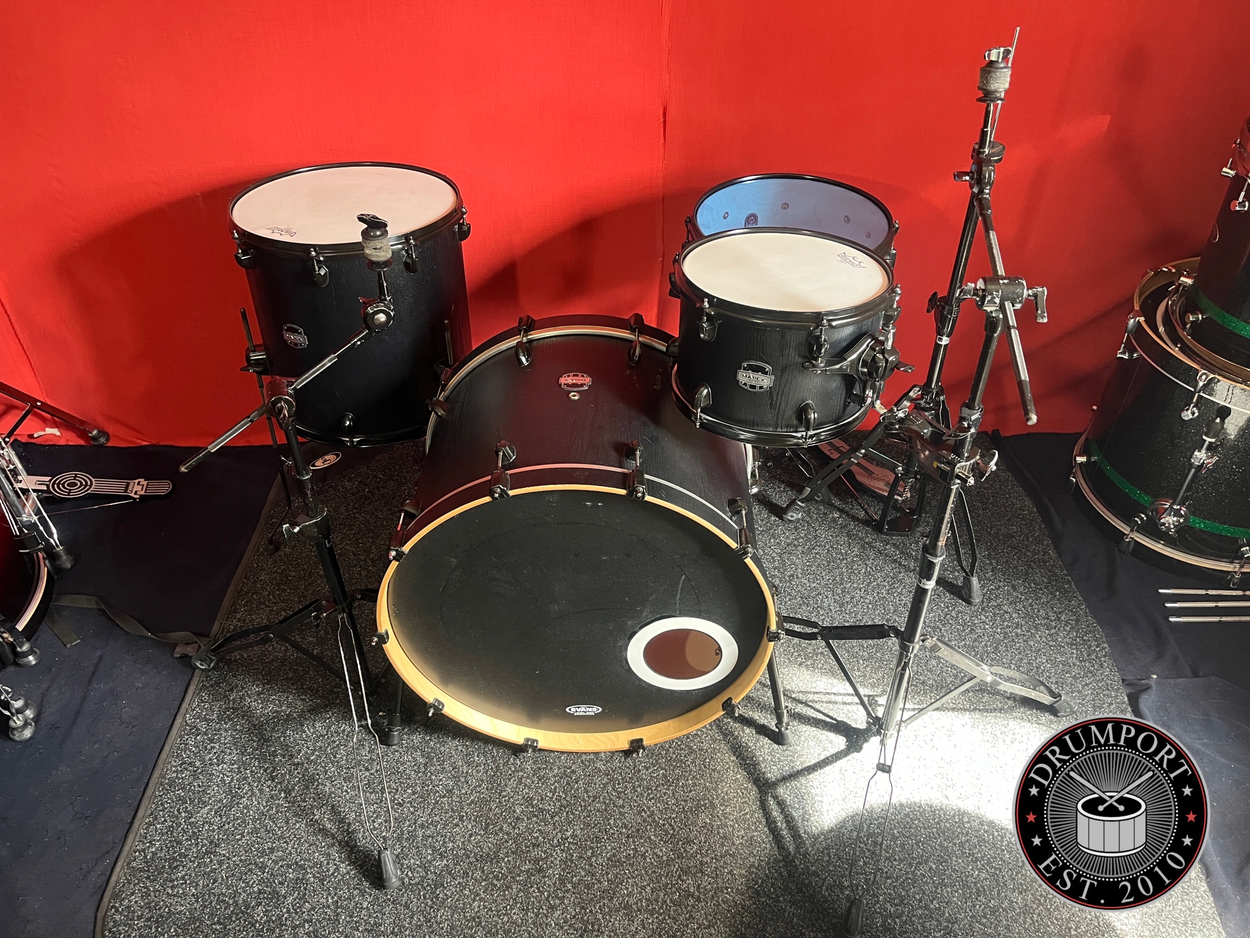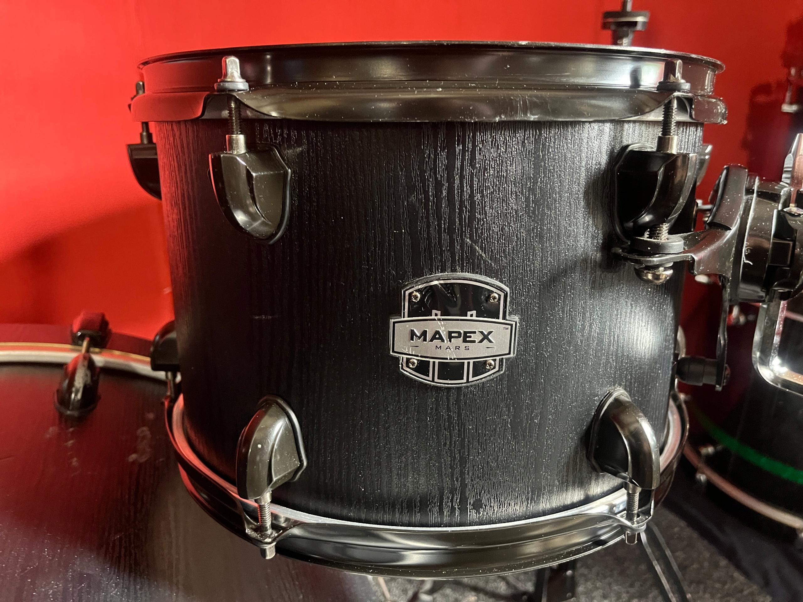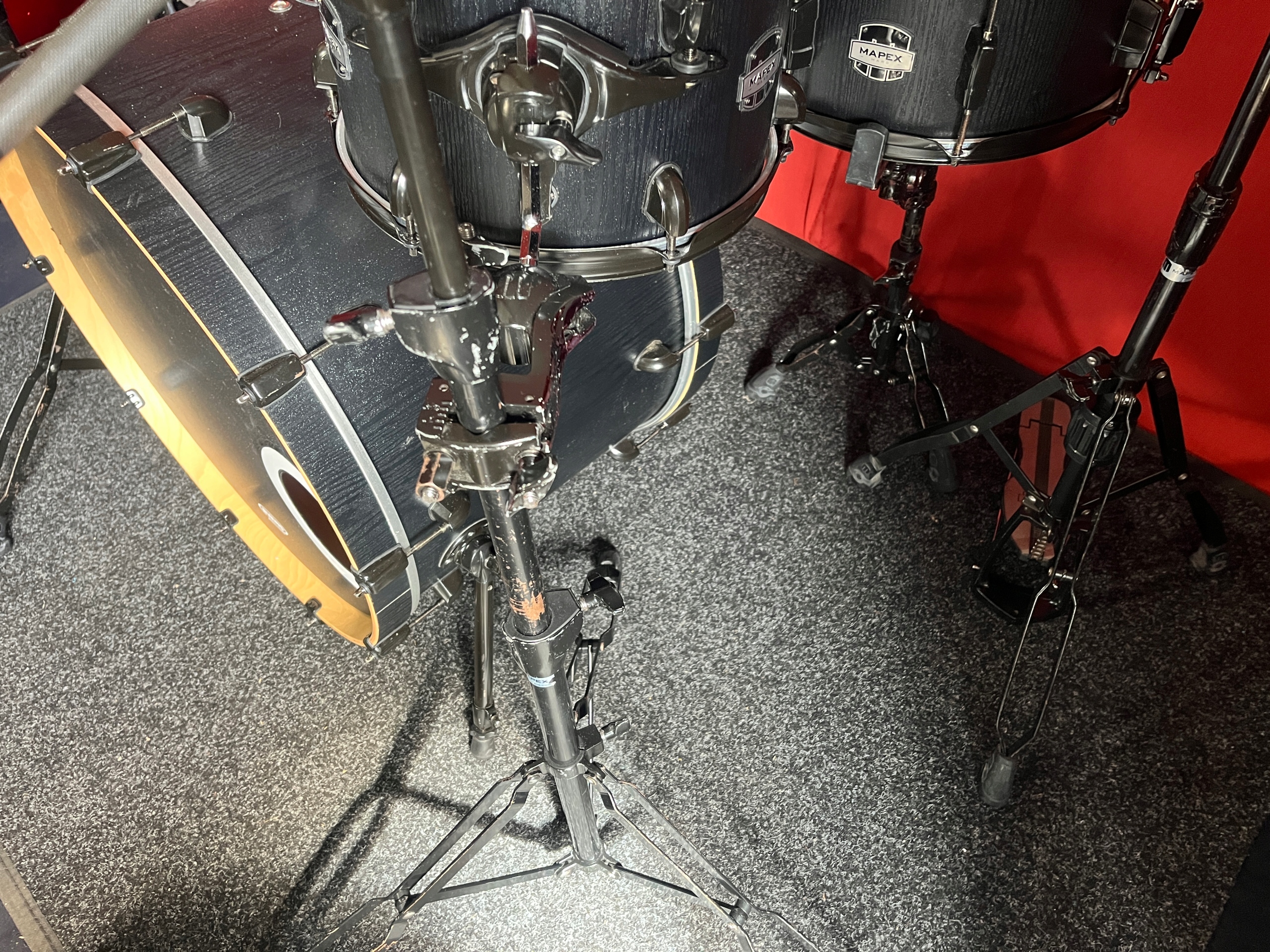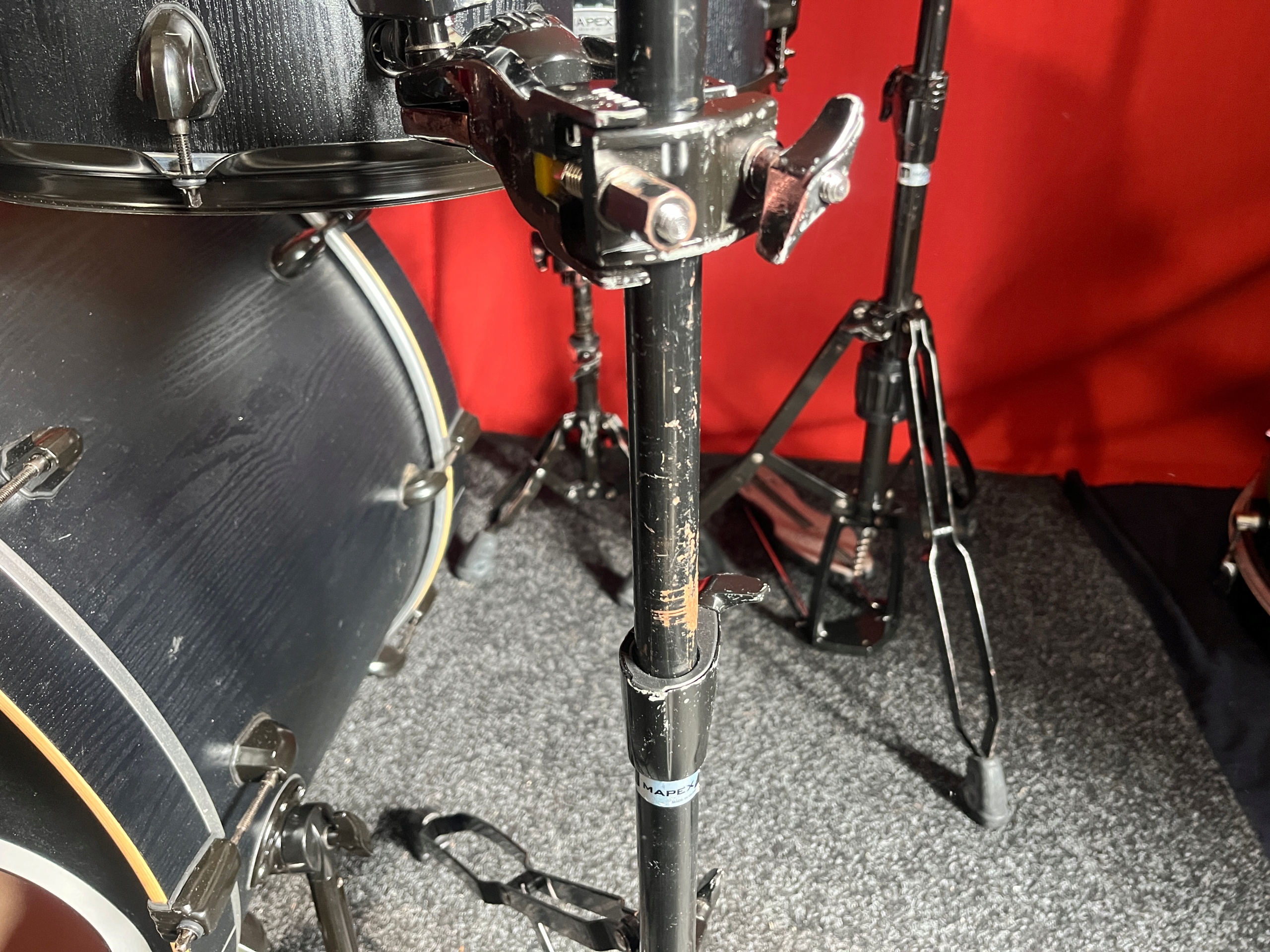 Perkusja jest w dobrym stanie i w pełni sprawna. Korpusy bębnów wykonane z brzozy. W komplecie bardzo solidny i oryginalny czarny hardware Mapexa, który posiada ślady korozji oraz obicia, ale funkcjonalnie wszystko sprawne.