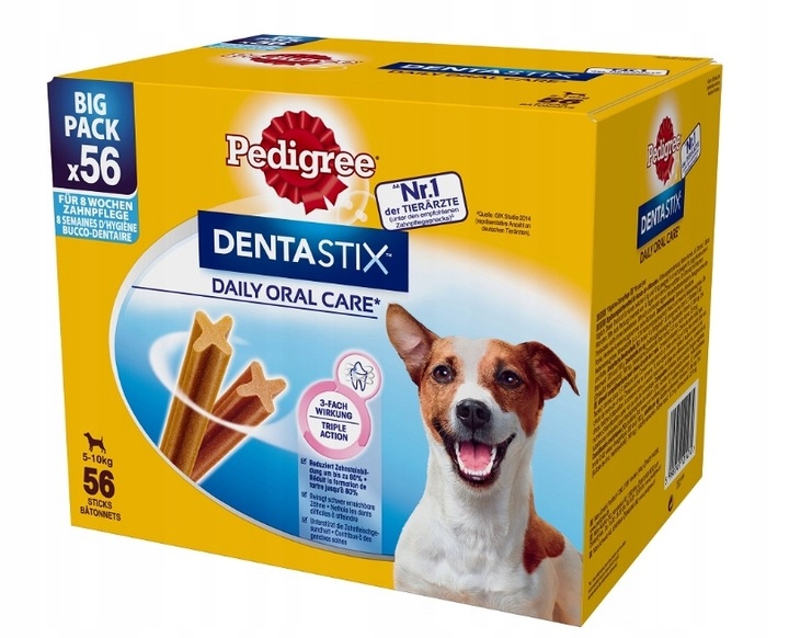 DentaStix Codzienna Pielęgnacja Jamy Ustnej to pokarm uzupełniający dla psów powyżej 4. miesiąca życia. Przeznaczony jest do gryzienia wyłącznie dla pupili o masie ciała od 5 do 10 kg. Ten przysmak działa pozytywnie na zęby i dziąsła psa oczyszcza i redukuje tworzenie kamienia nazębnego. Z PEDIGREE® DentaStix skutecznie troszczysz się o zdrowie i witalność swojego psa.