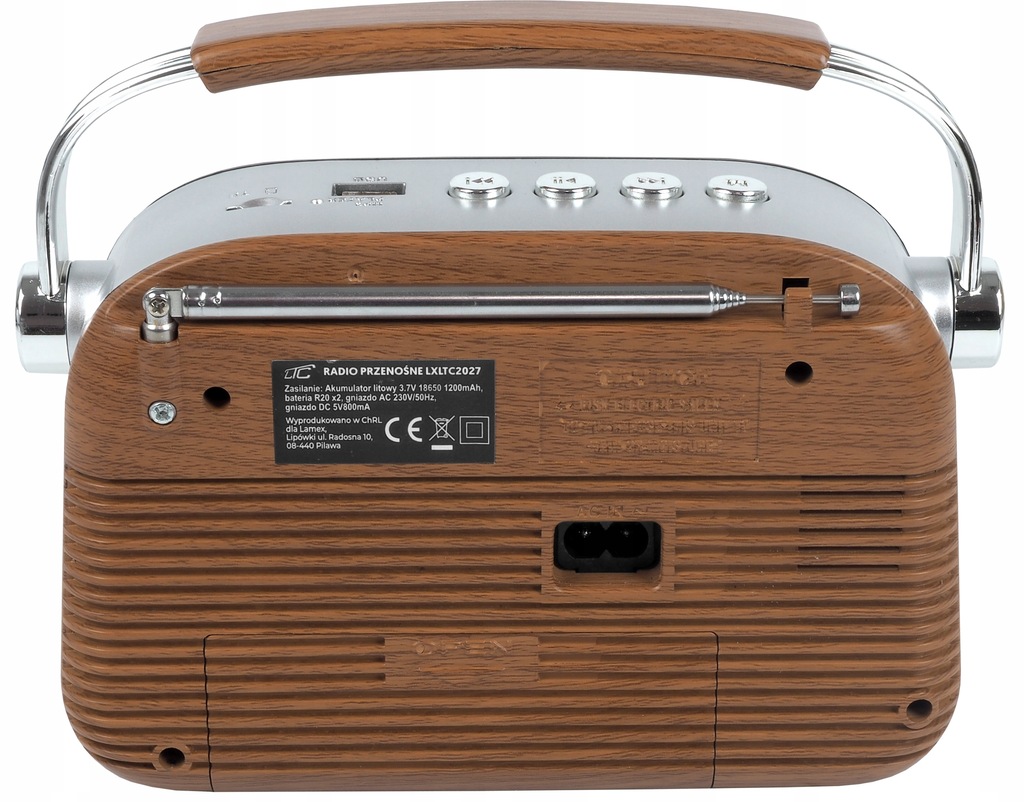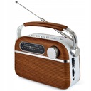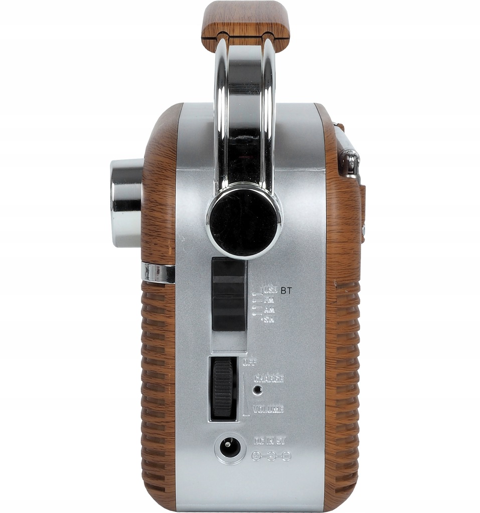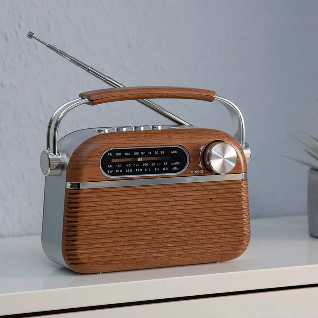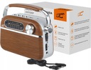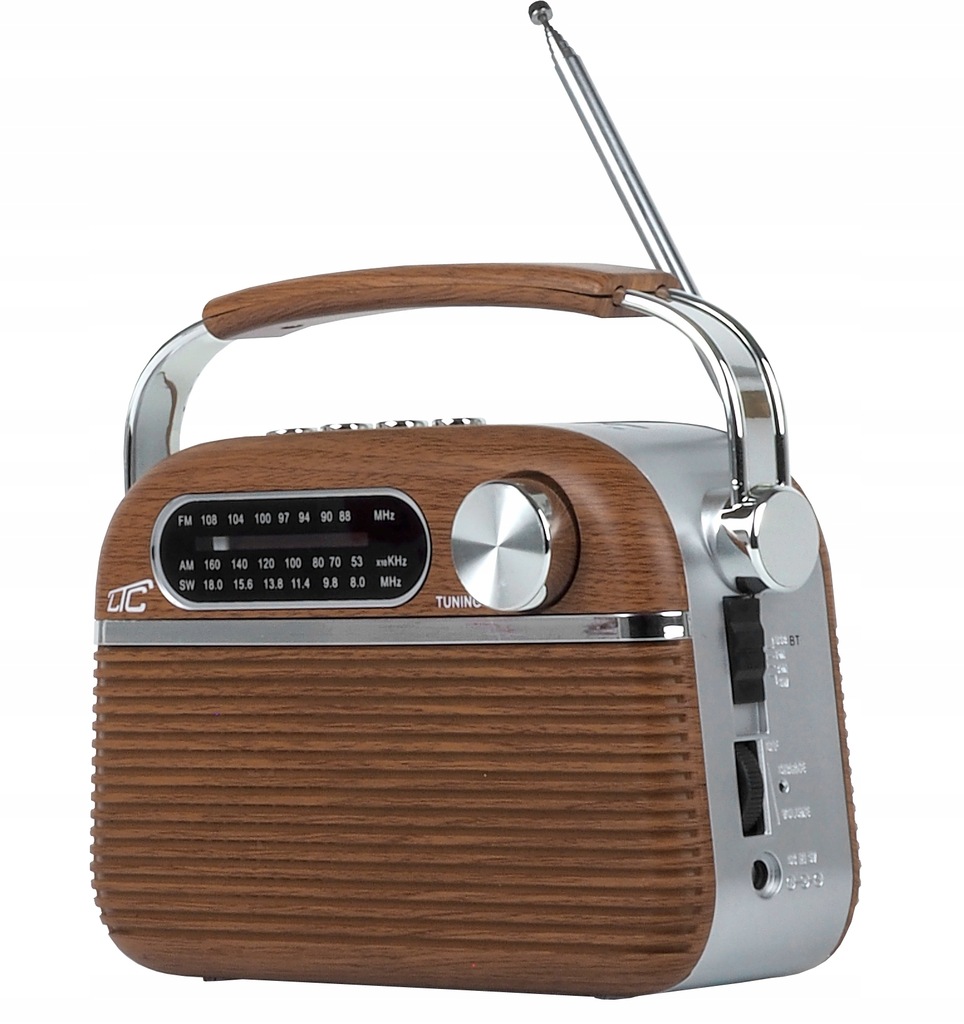 Kompaktowy radioodbiornik z teleskopową anteną i łącznością Bluetooth, nawiązujący stylistyką do urządzeń retro.