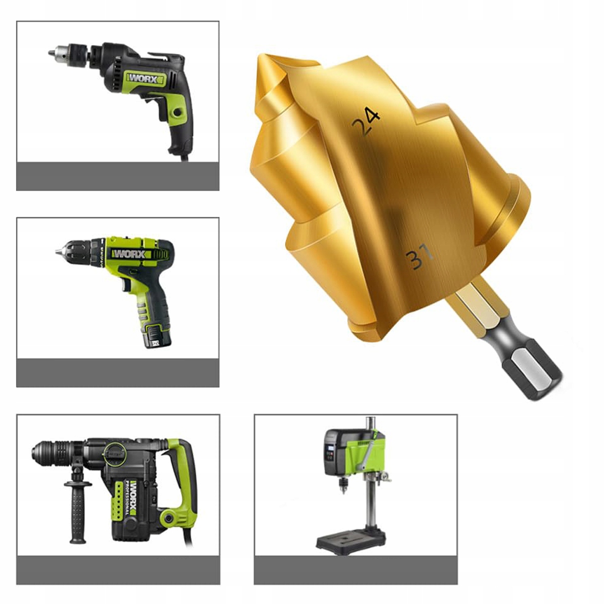 Każde wiertło ma trzonek sześciokątny 6,35 mm (1/4 cala), pasujący do większości elektronarzędzi: