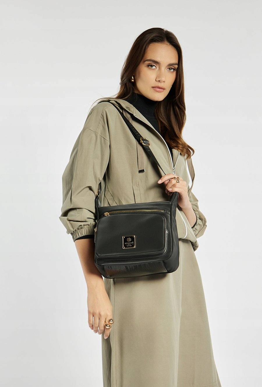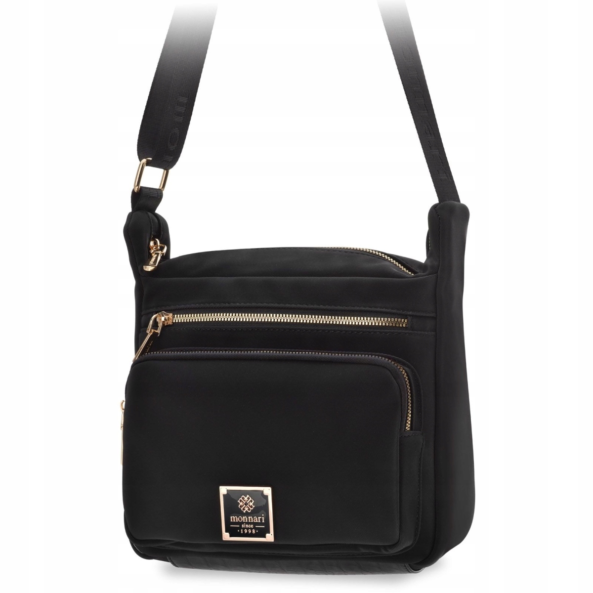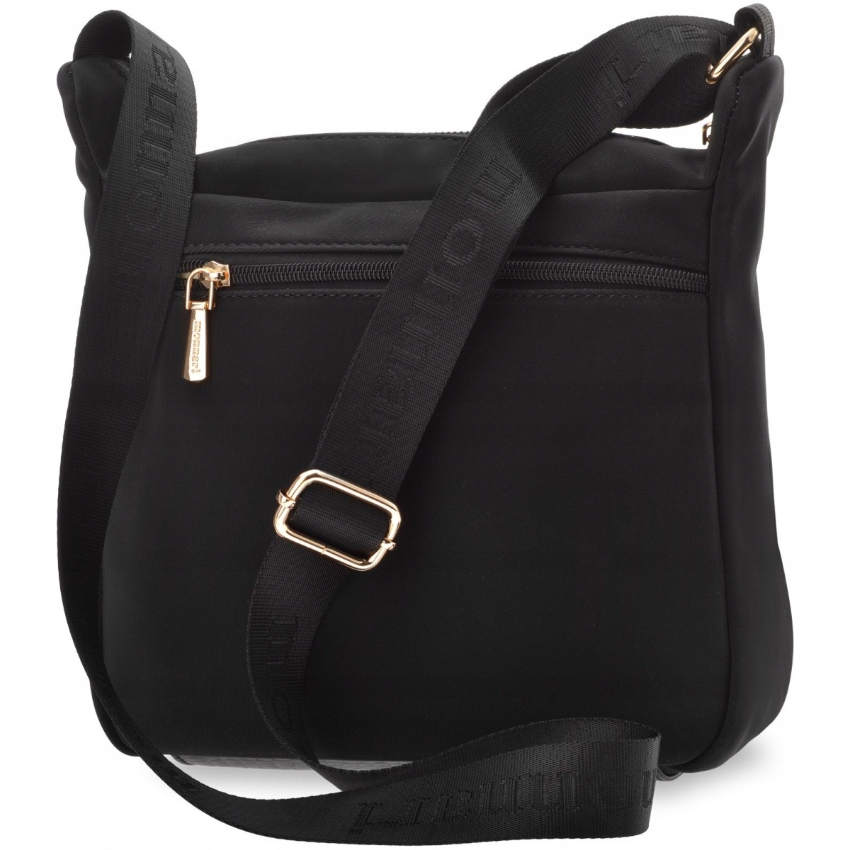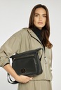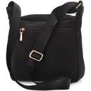 Praktyczna torba damska zawieszona na regulowanym pasku, Torba jednokomorowa o jasnej logowanej podszewce. Dodatkowym atutem są funkcjonalne kieszonki – dwie umieszczone z przodu oraz jedna z tyłu – które ułatwiają organizację najpotrzebniejszych drobiazgów i zapewniają szybki dostęp do nich. Torebkę należy przechowywać w dołączonym woreczku.