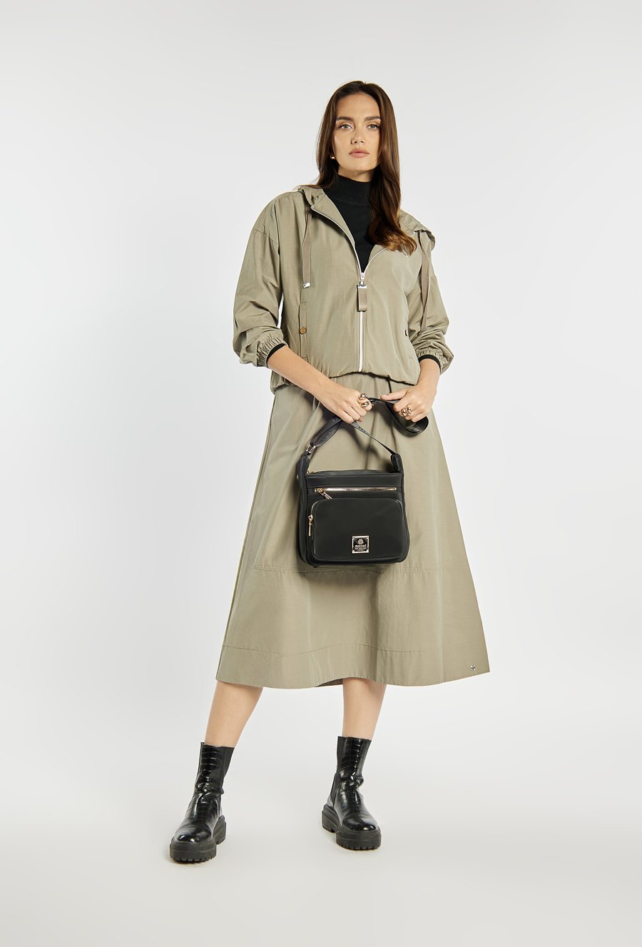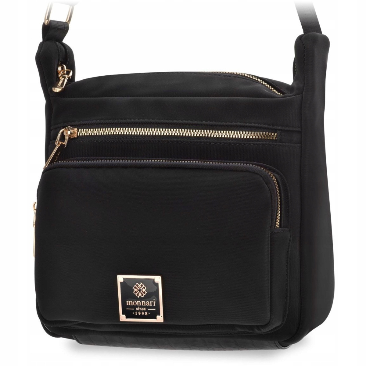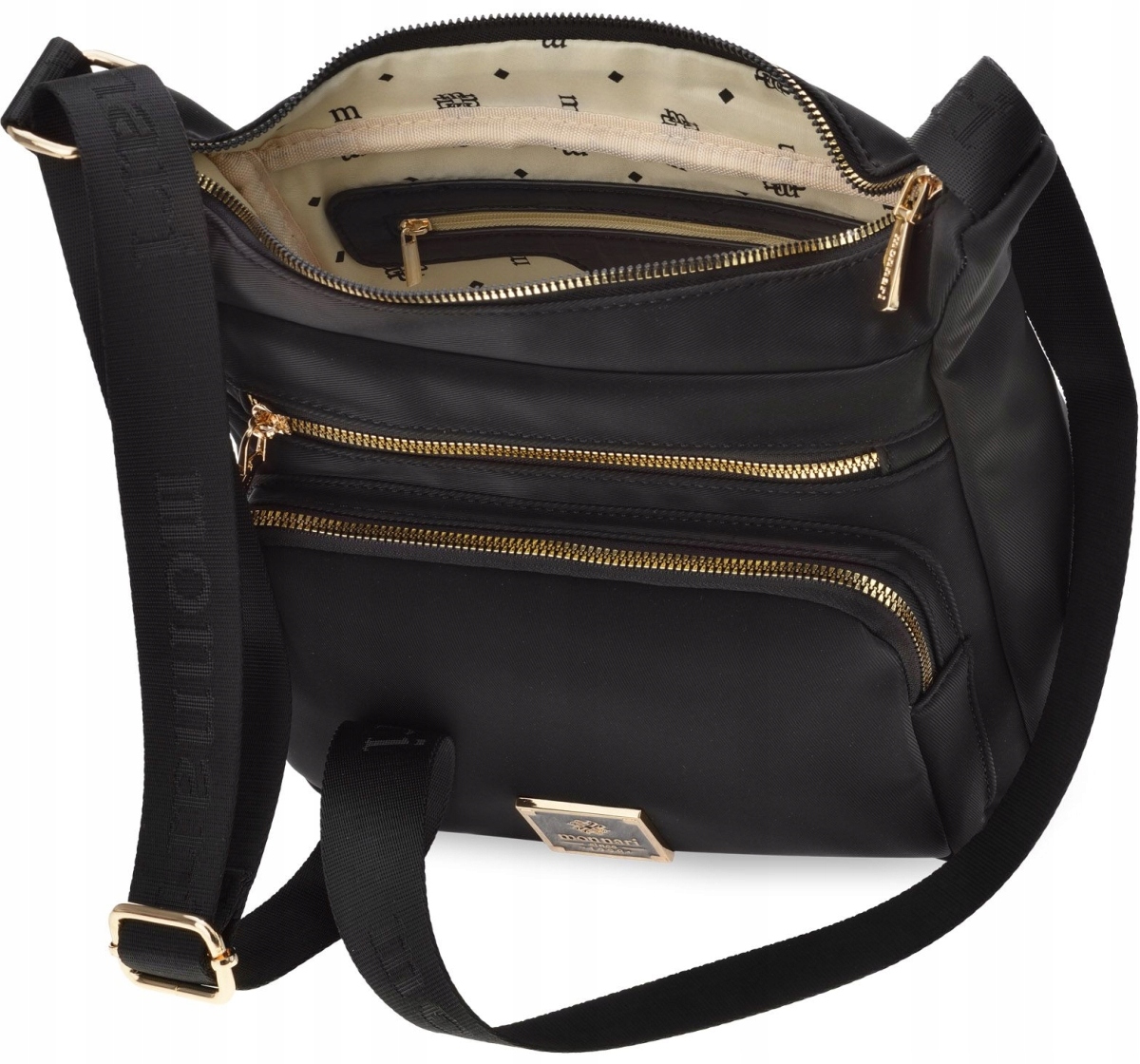 Praktyczna torba damska zawieszona na regulowanym pasku, Torba jednokomorowa o jasnej logowanej podszewce. Dodatkowym atutem są funkcjonalne kieszonki – dwie umieszczone z przodu oraz jedna z tyłu – które ułatwiają organizację najpotrzebniejszych drobiazgów i zapewniają szybki dostęp do nich. Torebkę należy przechowywać w dołączonym woreczku.