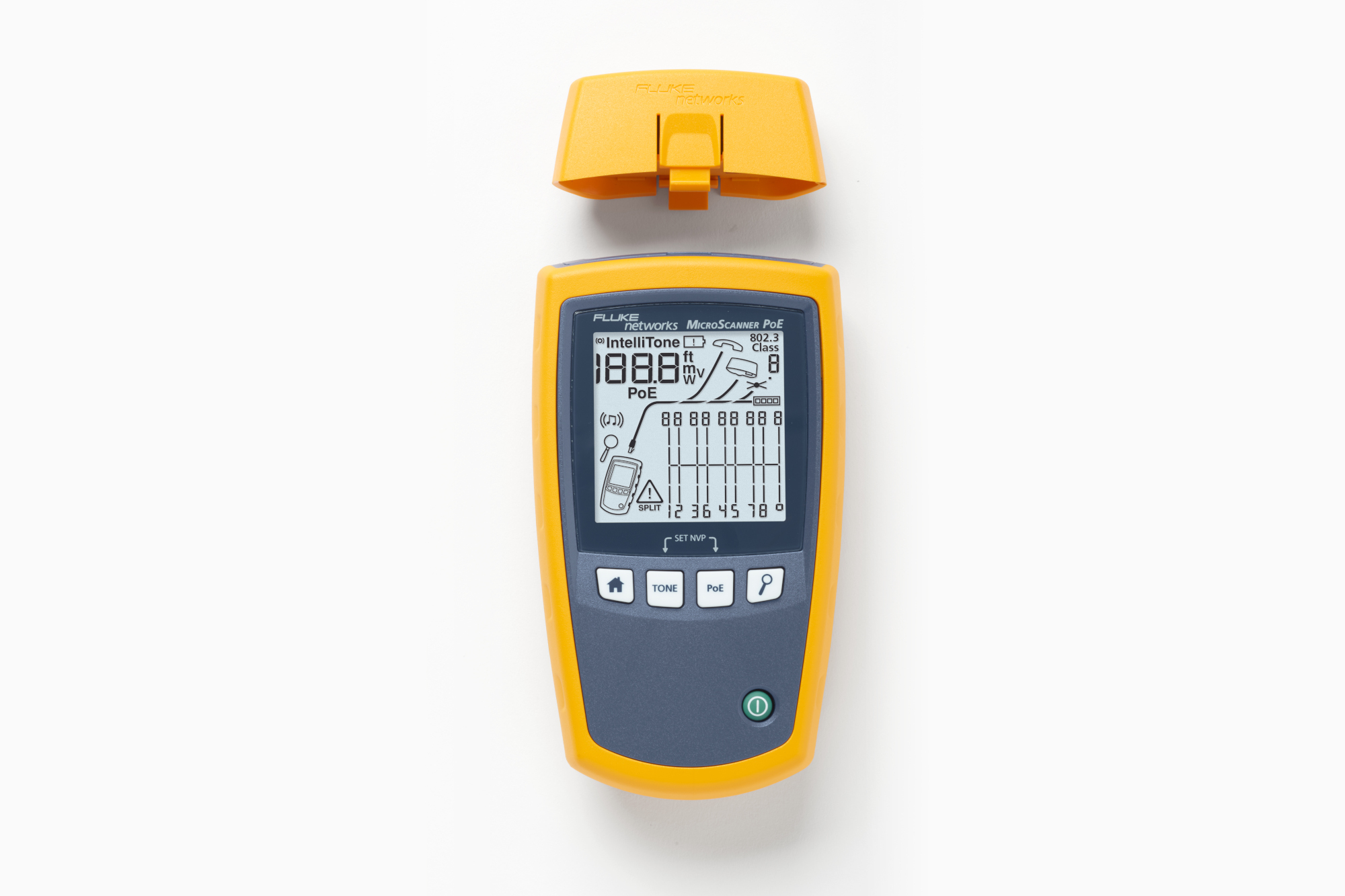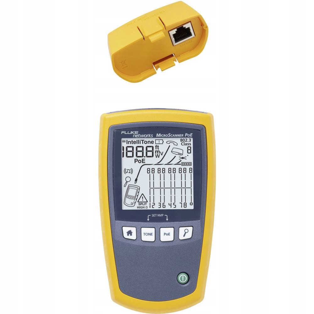 Microscanner PoE umożliwia szybką i łatwą weryfikację PoE. Tester pokazuje dostępną klasę PoE (0-8) urządzeń 802.3at, .3af i .3bt oraz napięcie pasywnych źródeł PoE. Dostępne są również dostępne usługi (do 10G), długość kabla, Wiremap, Kabel-ID, inteligentne tonowanie i odległość do uszkodzenia.