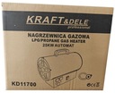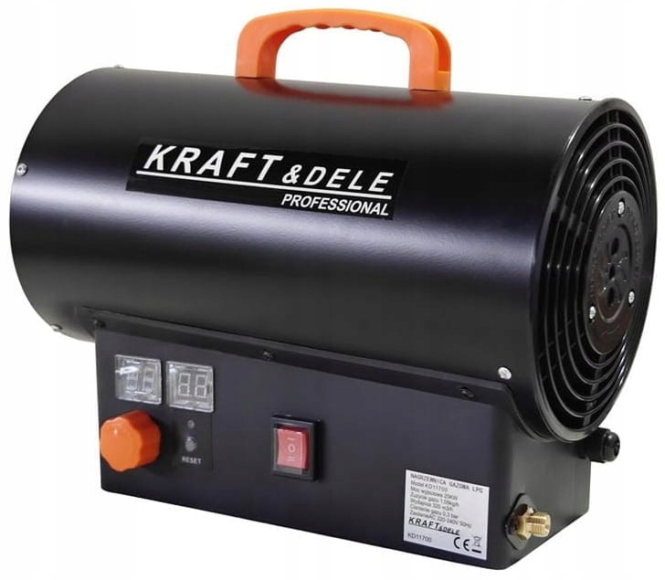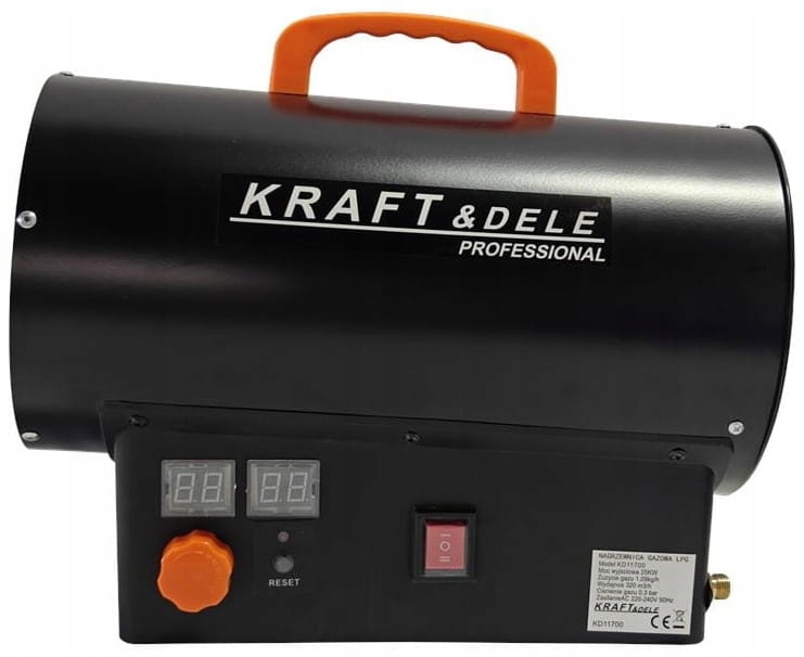 Nagrzewnica marki Kraft&Dele model KD11700 o mocy 25 KW na gaz propan-butan(LPG). Nagrzewnica posiada wbudowany termostat z regulacją temperatury i cyfrowy wyświetlacz, dzięki któremu można łatwo ustawić zamierzoną temperaturę otoczenia. Nagrzewnica działa automatycznie, w zależności od ustawienia temperatury.