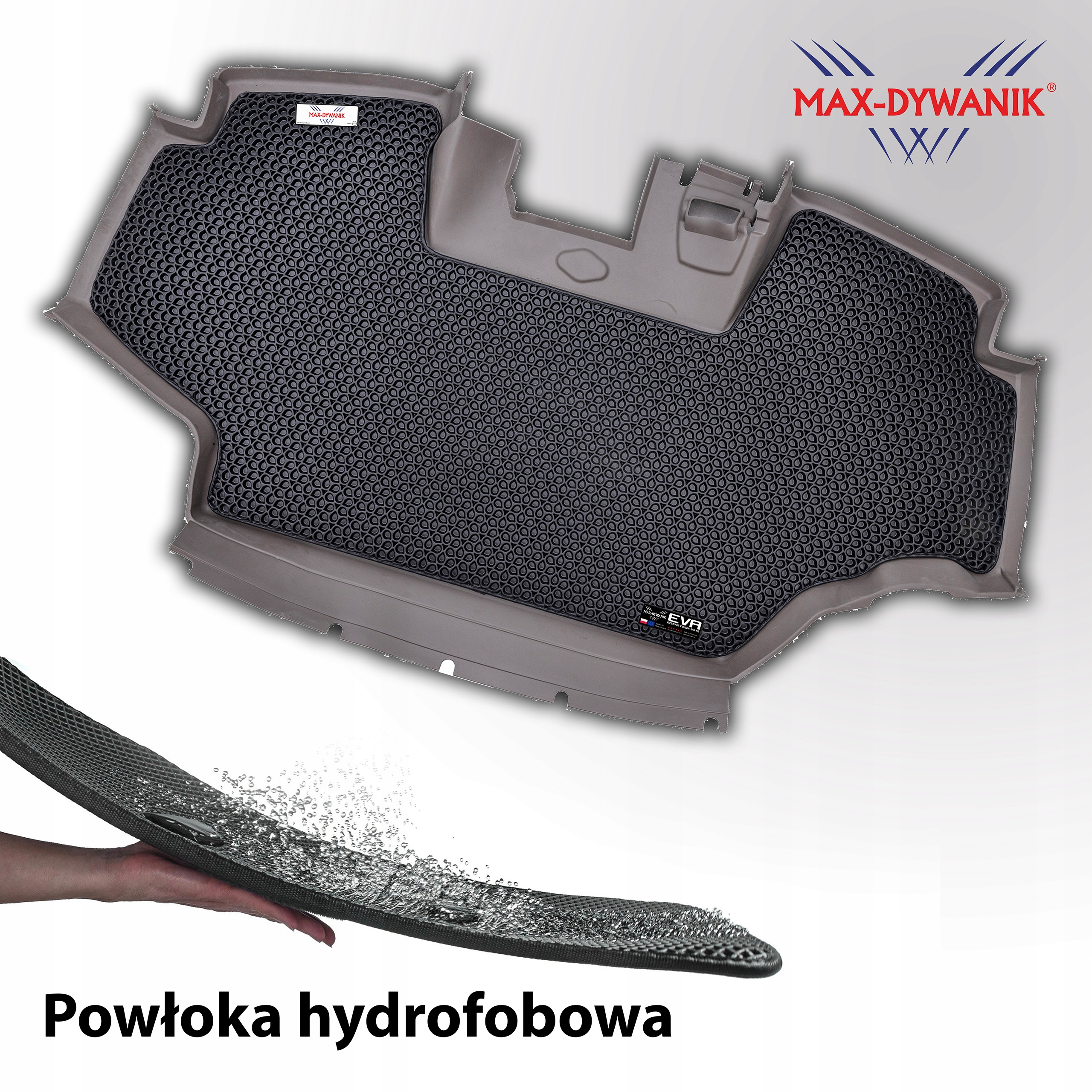Etykiety 3D zostały umieszczone na specjalnie zaprojektowanych mocowaniach Max-Dywanik, które, podobnie jak dywaniki, są odporne na wodę, błoto i warunki atmosferyczne. Na dywaniku zamontowane są 2 etykiety, które sygnują dywaniki i potwierdzają, że zostały wyprodukowane przez polską firmę MAX-DYWANIK i pochodzą z najnowszej linii EVA ETERNITY DEEP MATS.
