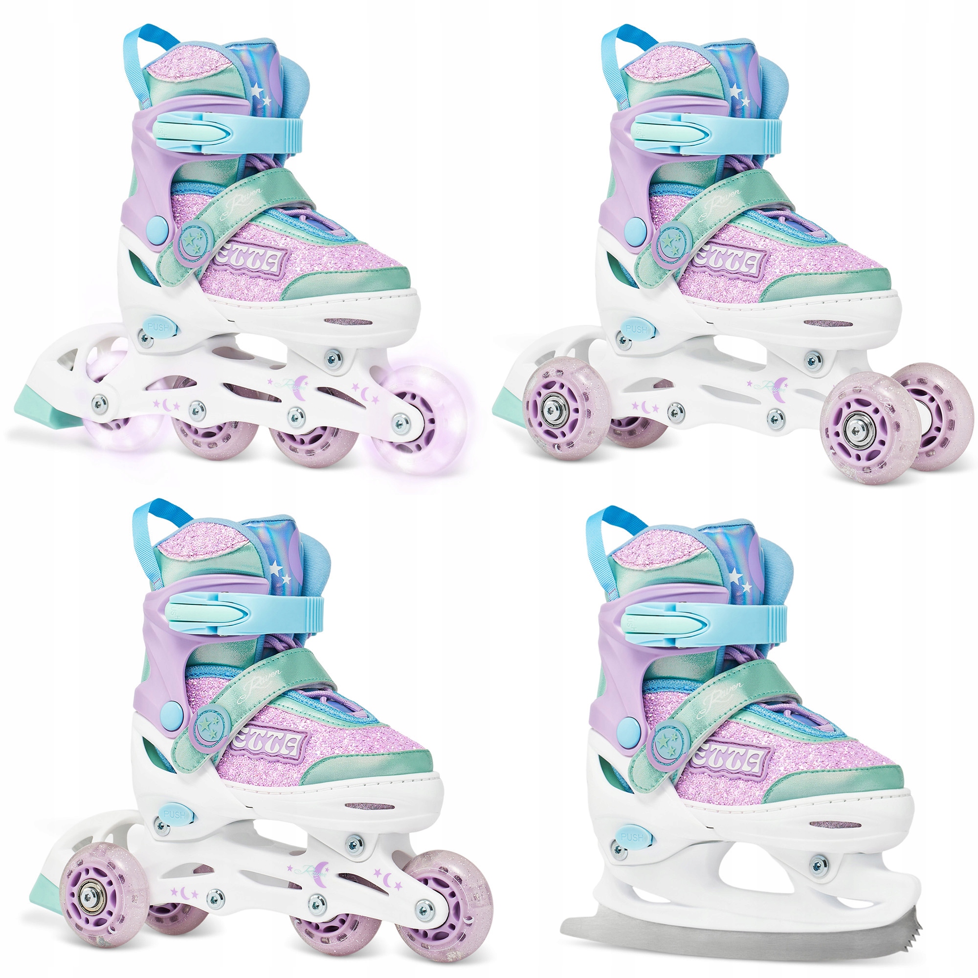 Sznurowadła, klamra z paskiem zębatym oraz zatrzask zapewniają odpowiednie ściągnięcie i pewne trzymanie stopy w bucie, zapobiegają przemieszczaniu się stopy i gwarantują bezpieczną jazdę. Zatrzaski w rolkach Raven posiadają przycisk, który zapobiega ich rozpinaniu podczas jazdy. Pasek na rzep pozwala przytrzymać sznurowadła, powstrzymując je przed przypadkowym rozwiązaniem.