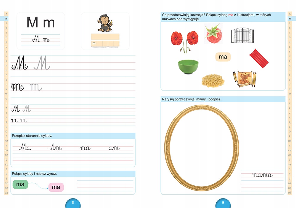 Książka podzielona jest na dwie części. W pierwszej zaprezentowane są literki, pokazany jest sposób ich zapisywania, jak łączą się z innymi literkami, tworząc sylaby, słowa i zdania. Mnóstwo zadań i ćwiczeń sprawia, że dzieci błyskawicznie przyswajają nowe wiadomości. W książce znajduje się dużo łamigłówek i zabaw, dzięki którym mali uczniowie mogą oderwać się i odpocząć podczas nauki. Są więc rebusy, labirynty, krzyżówki.