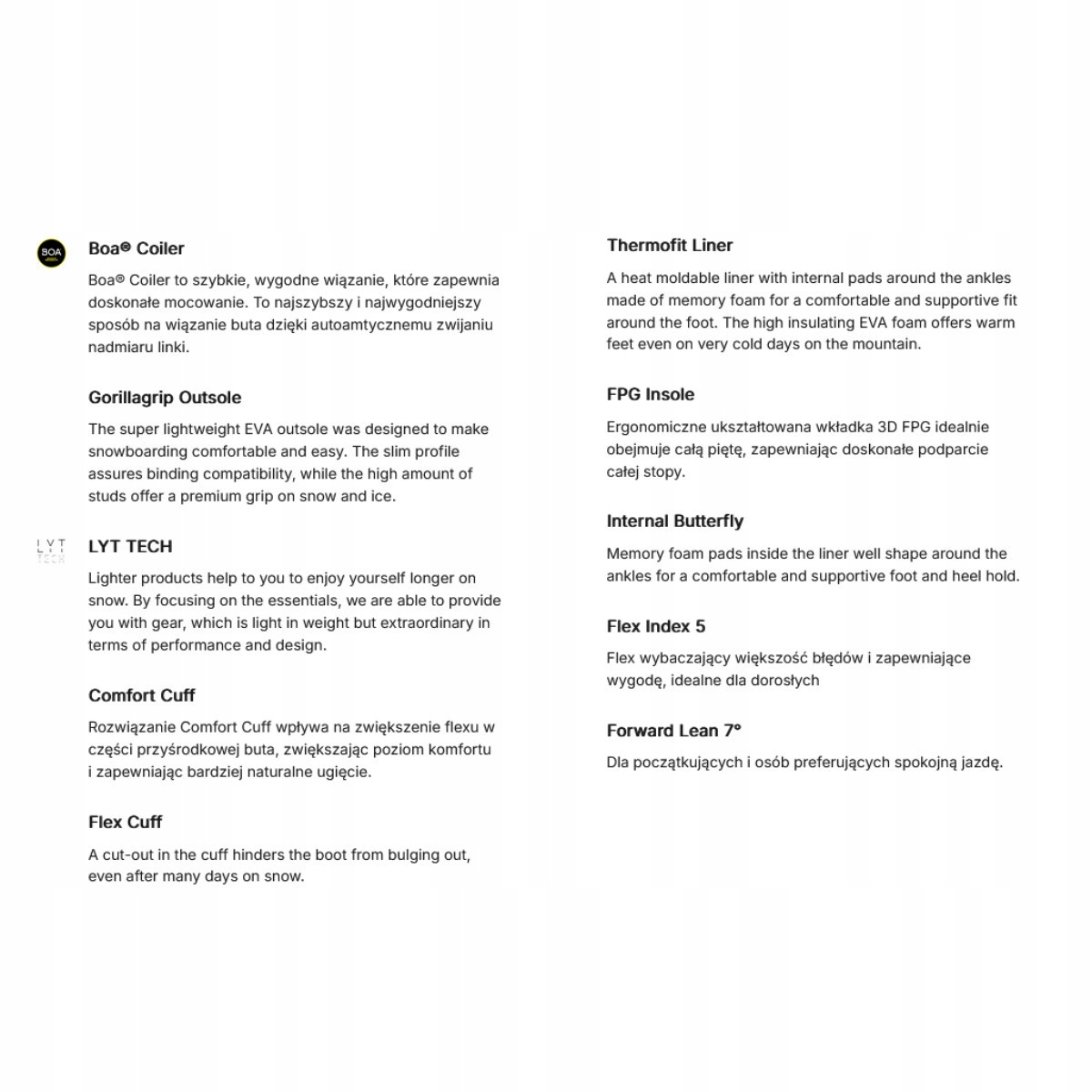 To idealny wybór dla snowboardzistów ceniących regularne wypady na stok, komfort i niezawodne osiągi. System sznurowania BOA® Coiler umożliwia błyskawiczne, automatyczne dopasowanie — wystarczy jeden obrót pokrętła, by idealnie dopasować but do stopy. Elastyczna cholewka wspiera naturalne ruchy i zwiększa trwałość modelu.