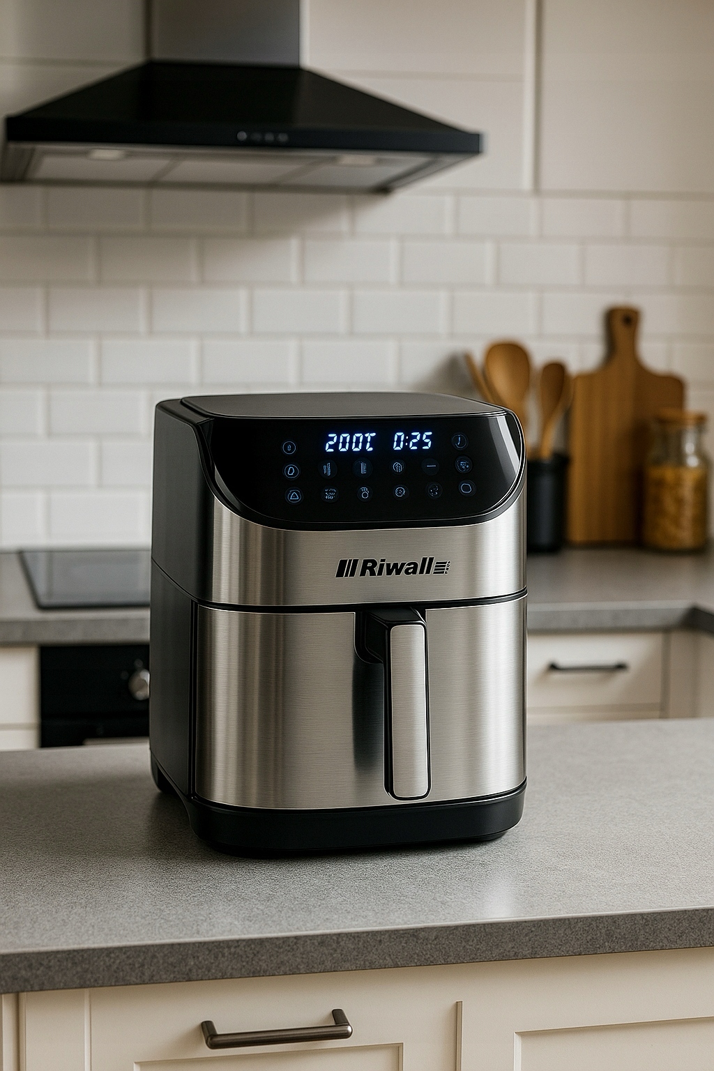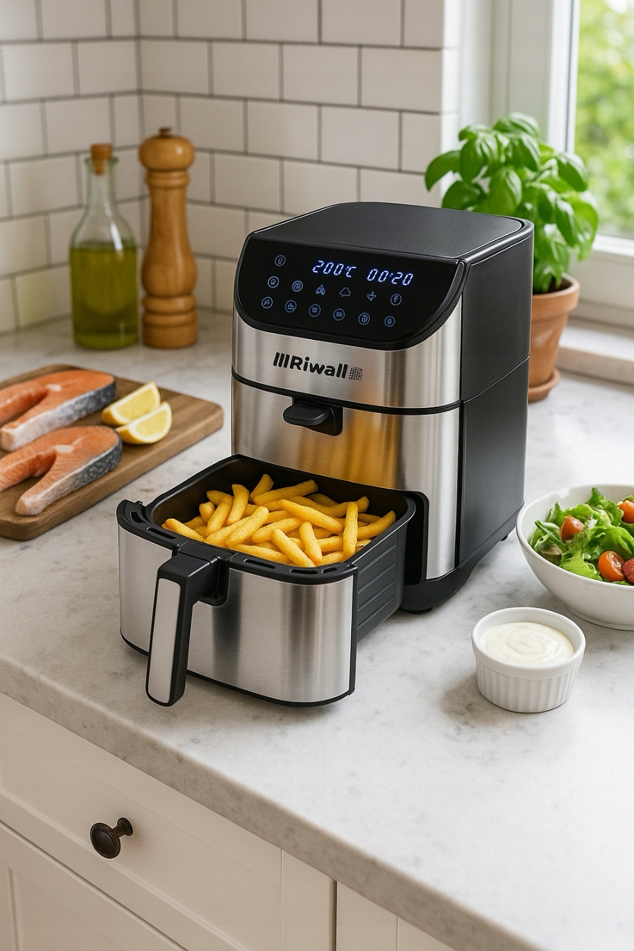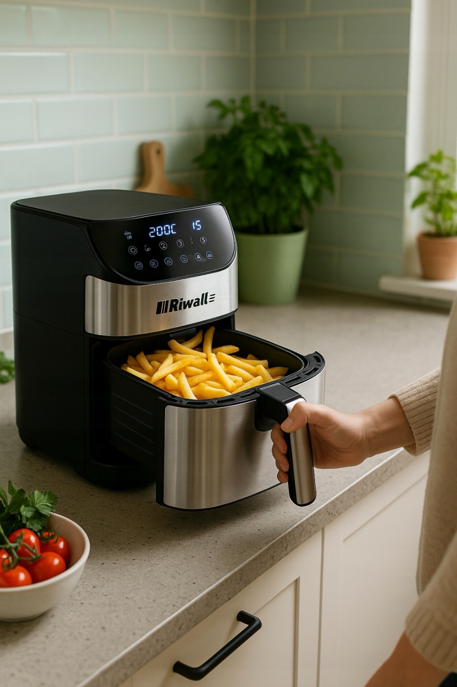 Frytkownica Beztłuszczowa Riwall GENOWEFA wykorzystuje gorące powietrze do perfekcyjnego przyrządzania ulubionych potraw i chrupiącej, nawet o 90% mniejszej zawartości tłuszczu.