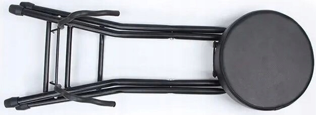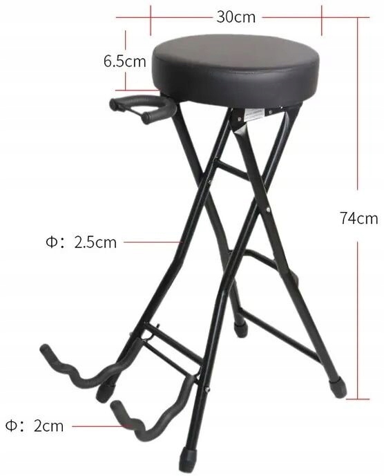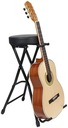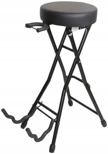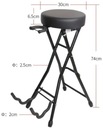stołek ze zintegrowanym uniwersalnym stojakiem gitarowym, wyściełane siedzisko ze sztucznej skóry o grubości 65 mm o średnicy 295 mm, wysokość siedziska od podłoża 72 cm, guma chroniąca gitarę przed uderzeniami i zarysowaniami, w pełni składana dla łatwego transportu, wykonana z aluminium, waga 3.4 kg, kolor czarny
