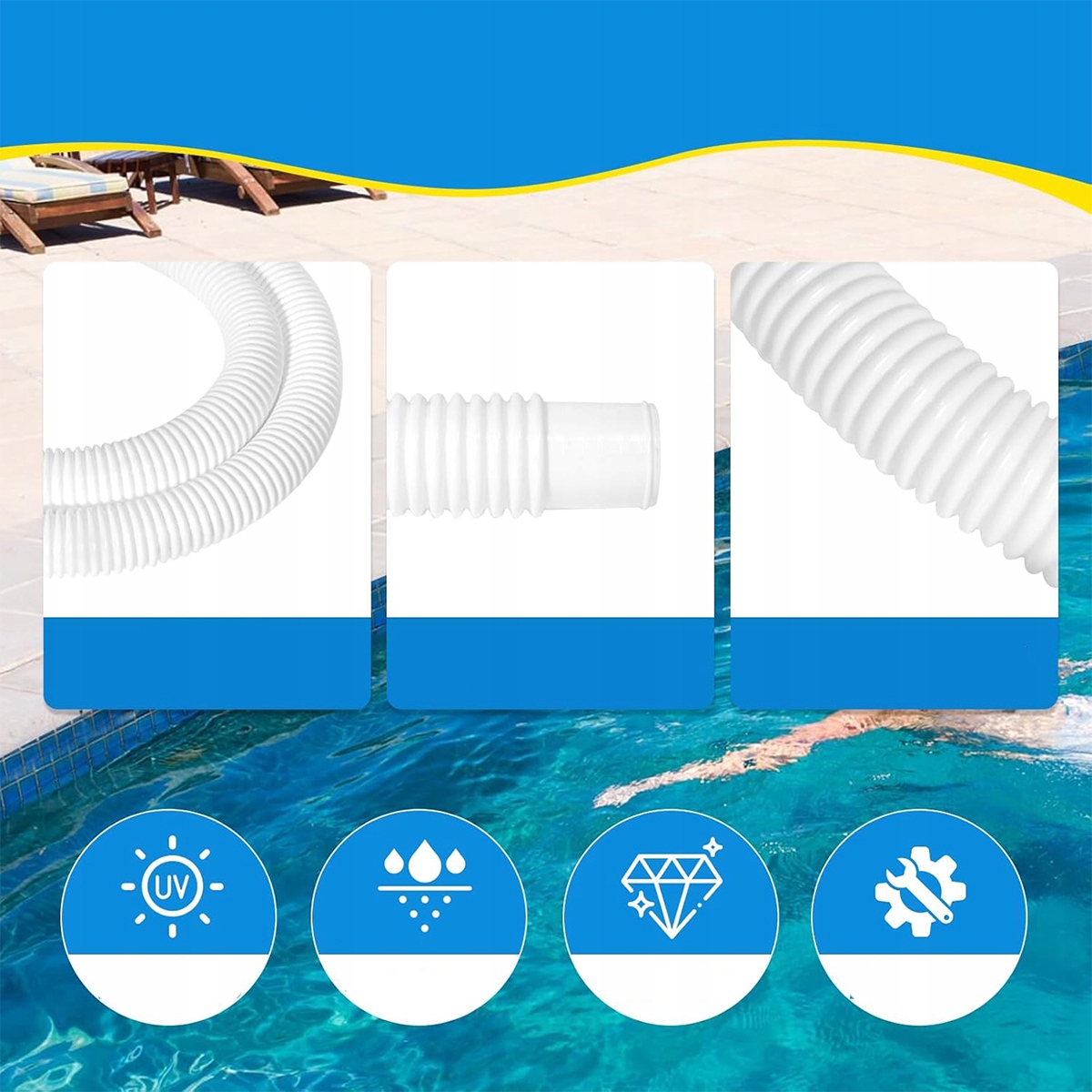 CIESZ SIĘ LATEM: Materiał nie zawiera plastyfikatorów ani metali ciężkich i jest wolny od toksyn. Dzięki tym 32 mm/1,25-calowym wężom do basenów naziemnych możesz zapewnić płynną pracę swojego basenu i systemu pomp, dzięki czemu będziesz czuć się szczęśliwy i cieszyć się czasem spędzonym przy basenie latem.