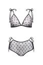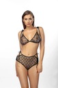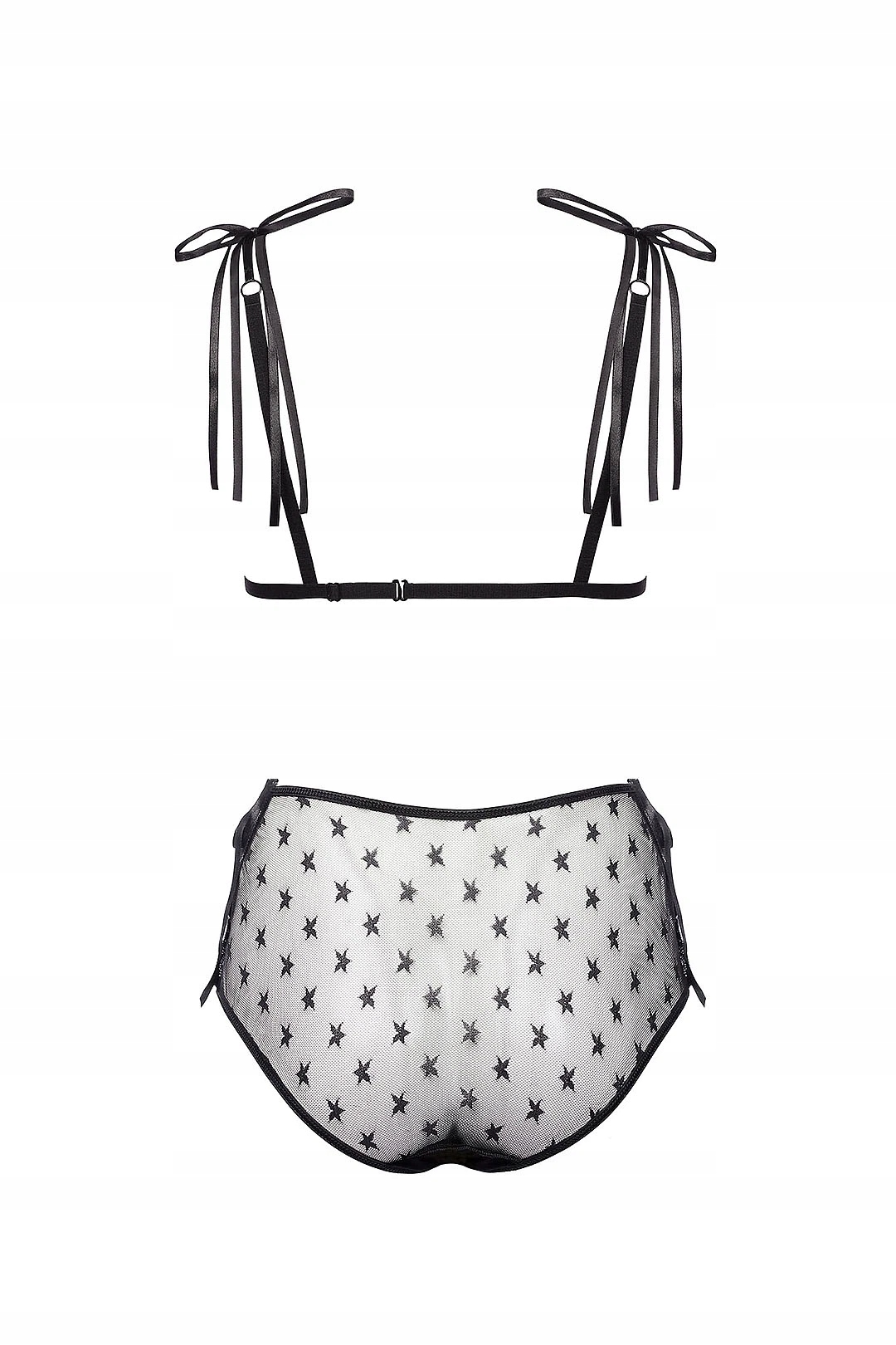 Śliczny, kuszący, dwuczęściowy komplet bielizny wykonany z elastycznego, lekko prześwitującego tiulu, w małe, słodkie gwiazdki. Uroczo wiązany - ramiączka biustonosza są wiązane na ramionach, zaś figi posiadają wiązania po bokach bioder. Całość jest niesamowicie kokieteryjna i sexy. Skład: 80% poliamid, 20% elastan.