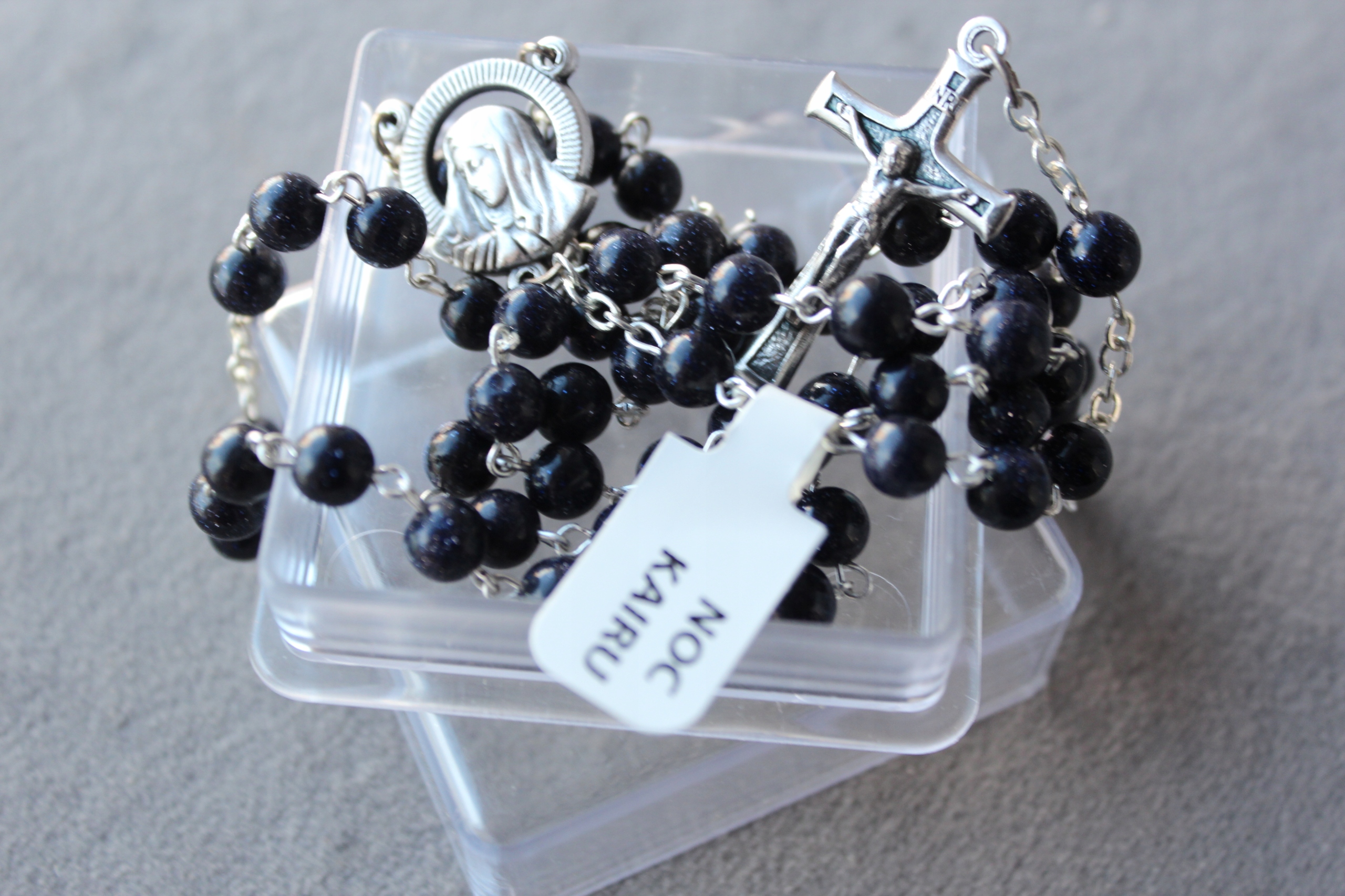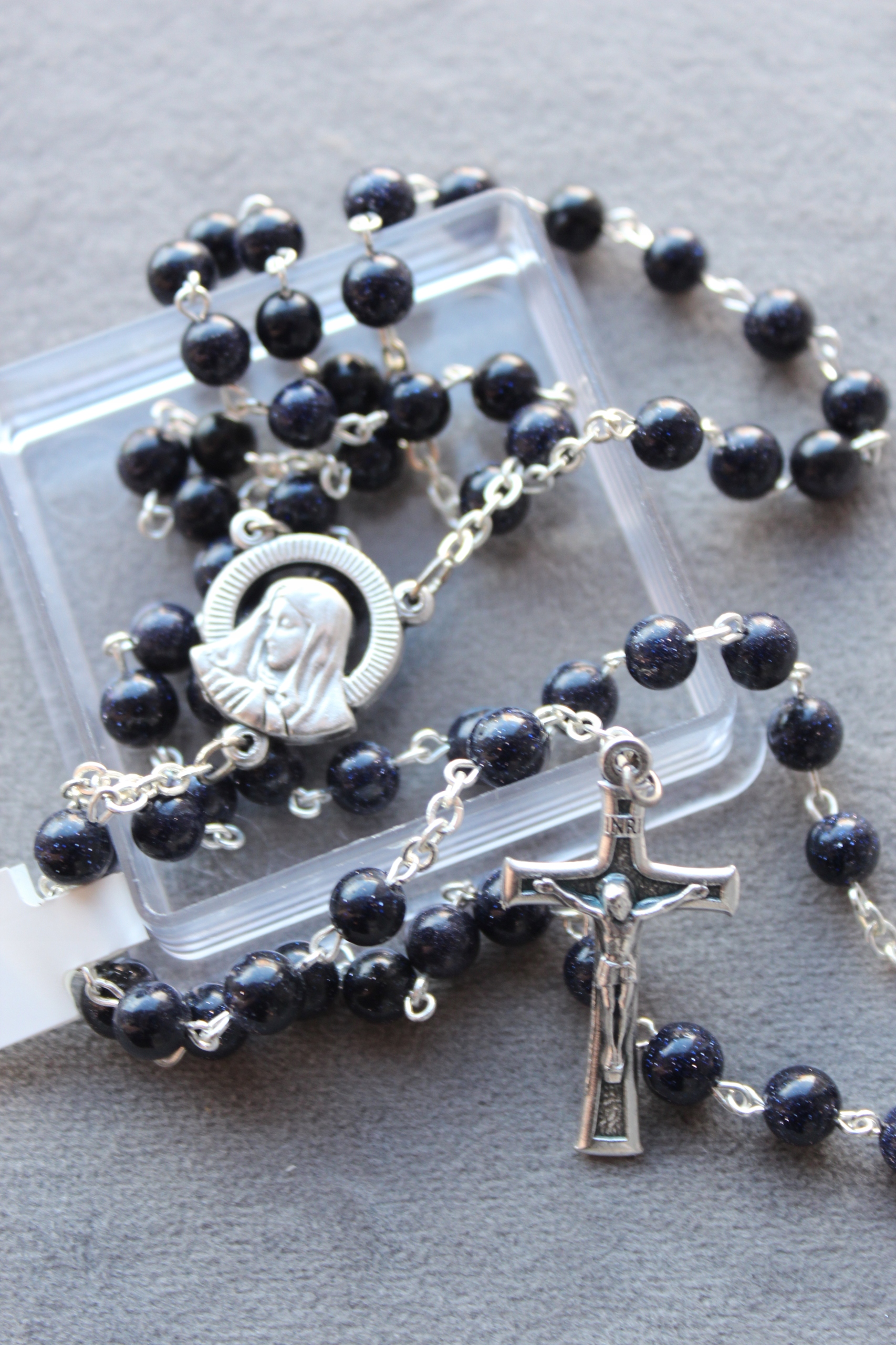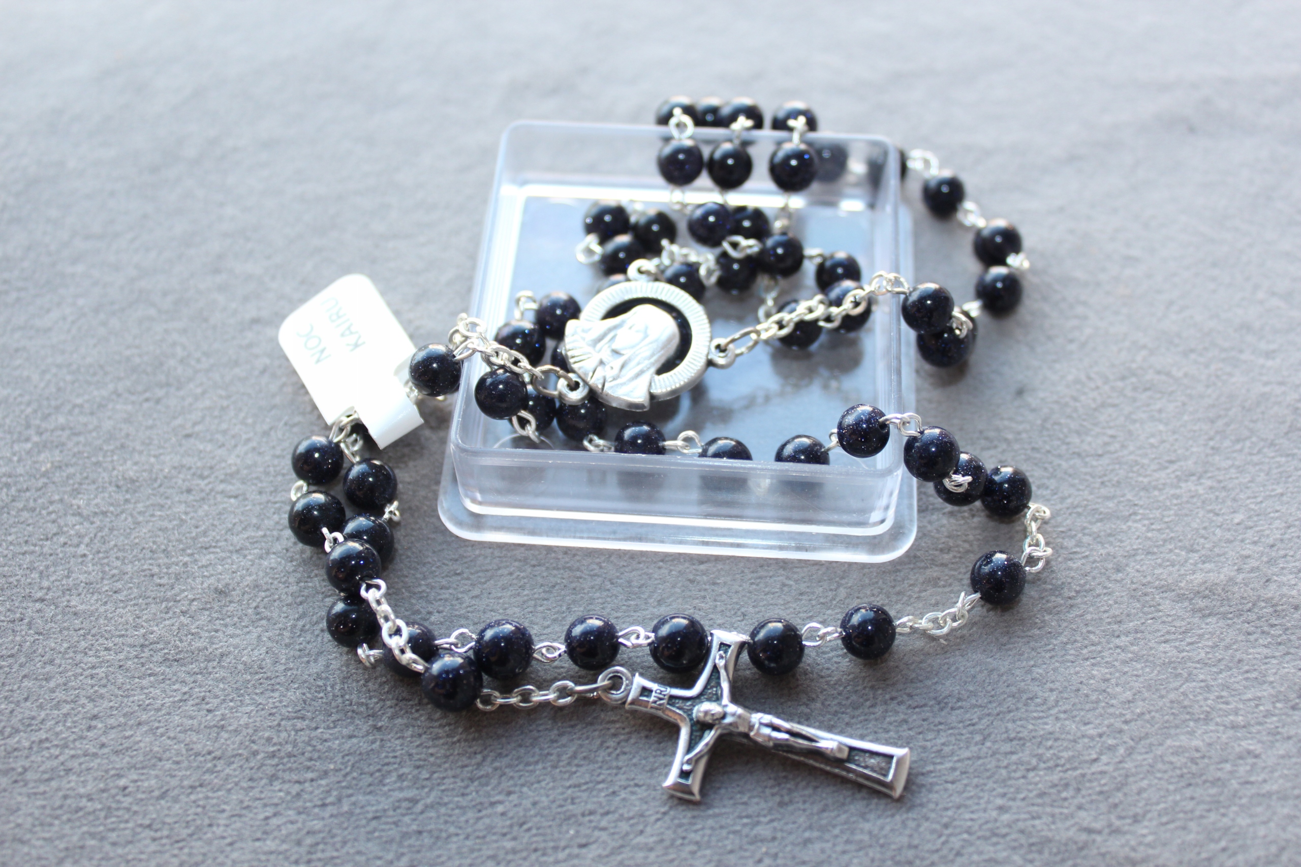 Głęboki granat z połyskującymi drobinami sprawia, że różaniec wygląda niezwykle szlachetnie i idealnie nadaje się jako pamiątka Pierwszej Komunii Świętej dla chłopca.
