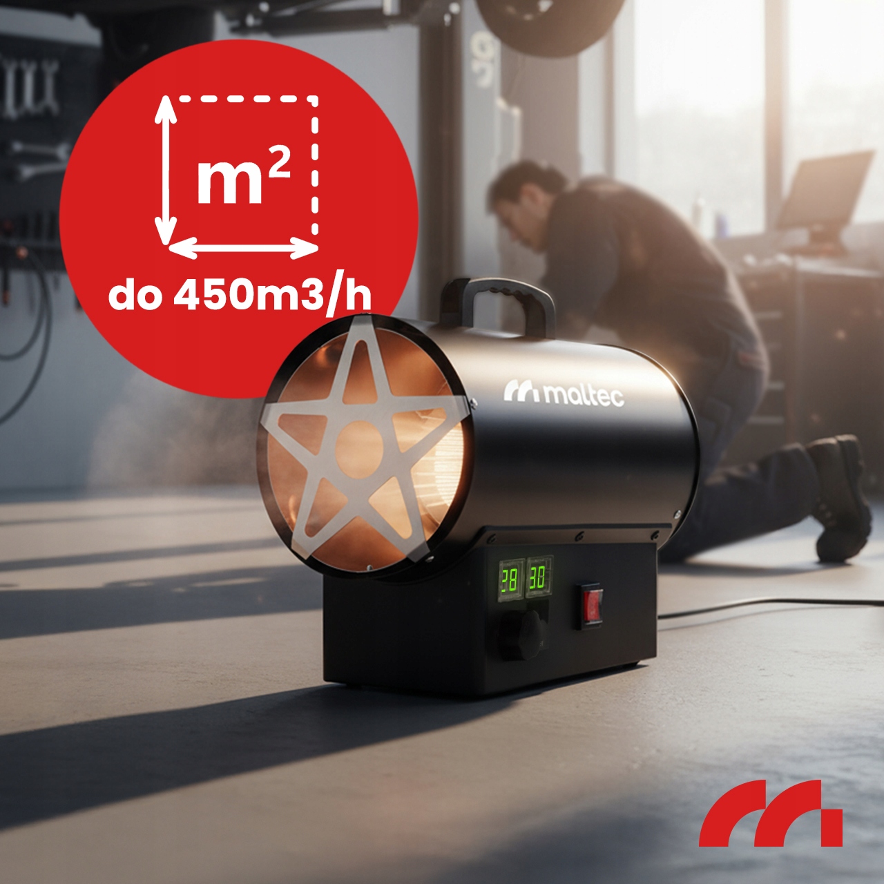 Nagrzewnica Maltec posiada wbudowany termostat oraz regulację temperatury na cyfrowym wyświetlaczu. Od teraz bez problemu można w prosty sposób ustawić pożądaną temperaturę otoczenia.