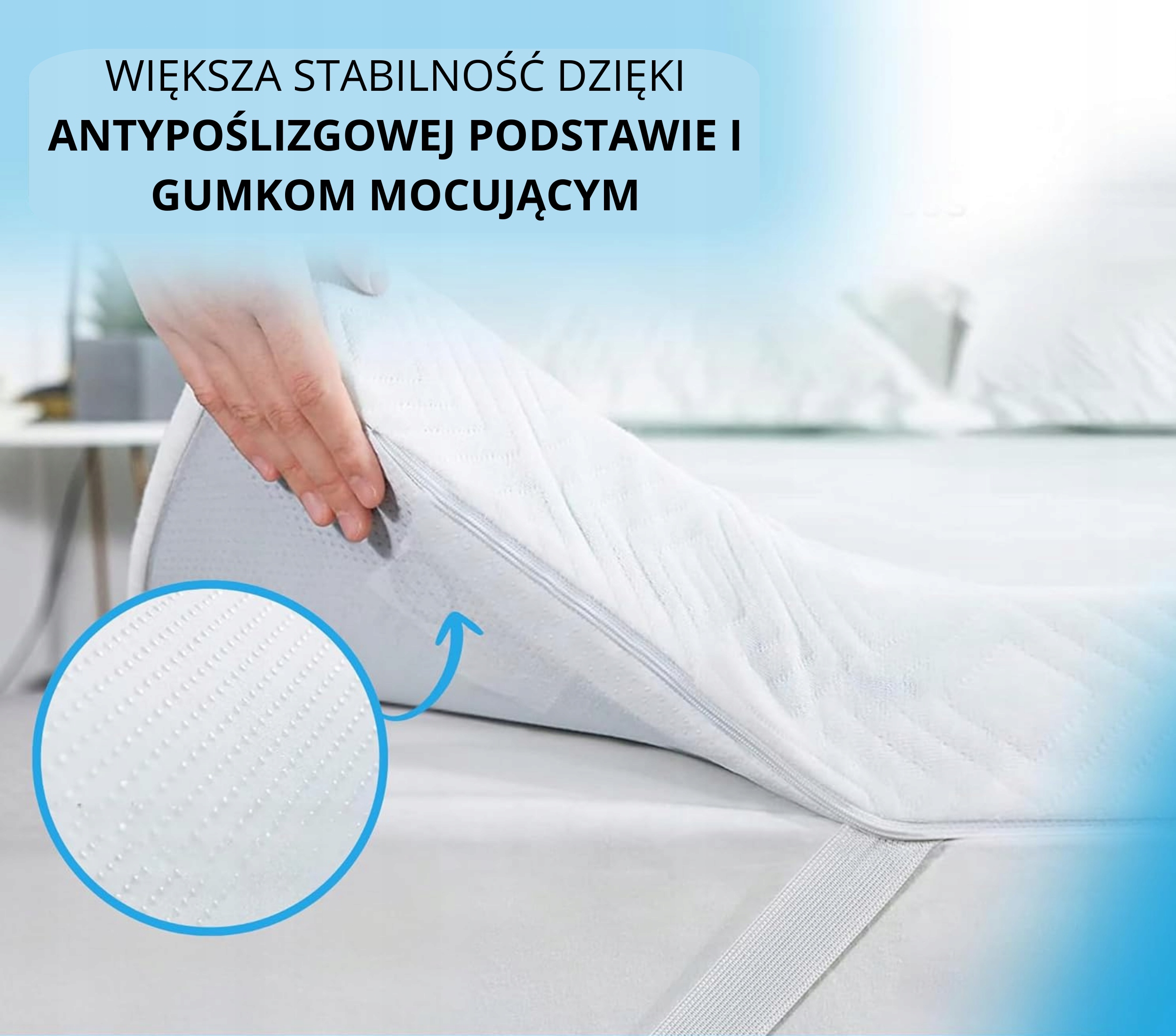 ✅ S���𝗶𝗹𝗻𝗼𝘀́𝗰́ 𝗱𝘇𝗶𝗲̨𝗸𝗶 𝗮𝗻𝘁𝘆𝗽𝗼𝘀́𝗹𝗶𝘇𝗴𝗼𝘄𝗲𝗷 𝗽𝗼𝘄𝗶𝗲𝗿𝘇𝗰𝗵𝗻𝗶 𝗶 𝗴𝘂𝗺𝗸𝗼𝗺: Topper nie przesuwa się dzięki antypoślizgowemu spodowi i czterem elastycznym paskom w rogach. Idealne rozwiązanie również na śliskich materacach i dla osób niespokojnie śpiących.