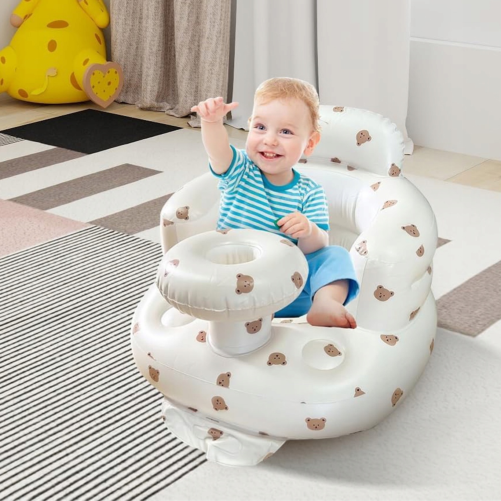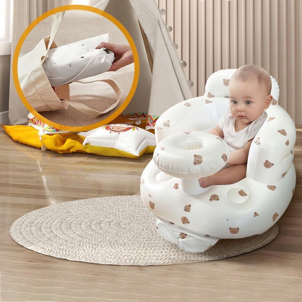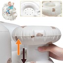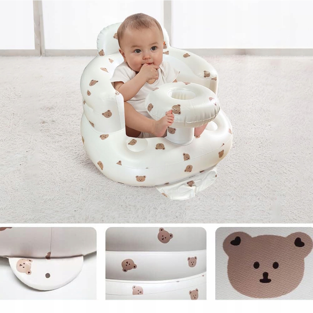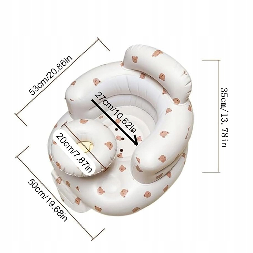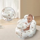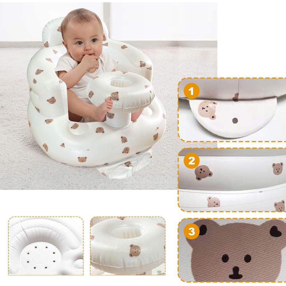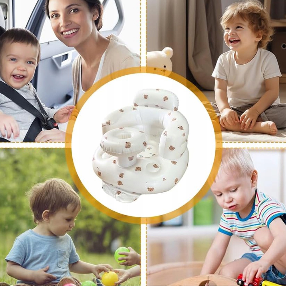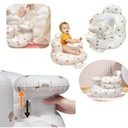 Fotelik dmuchany z otulającą konstrukcją zapewnia stabilizację pleców, boków i nóg dziecka, tworząc bezpieczne i wygodne środowisko do siedzenia.