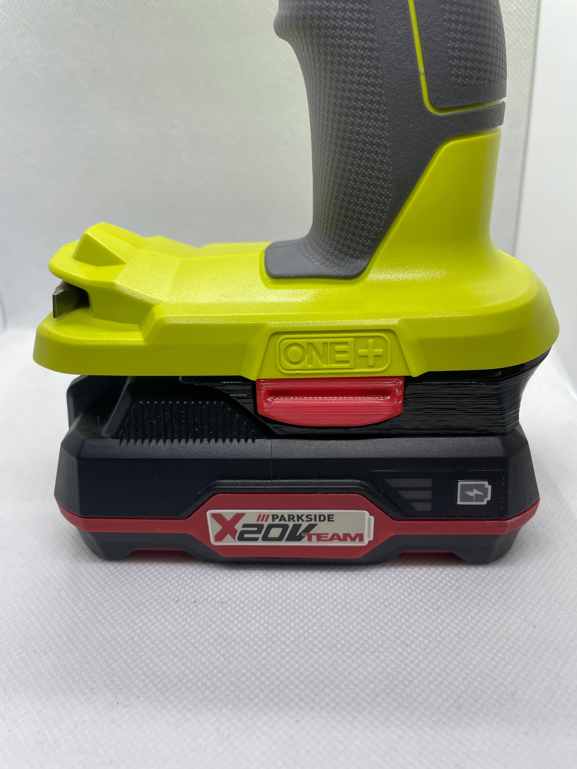 Wystarczy podłączyć baterię Parkside i wsunąć adapter do urządzenia Ryobi One+ .