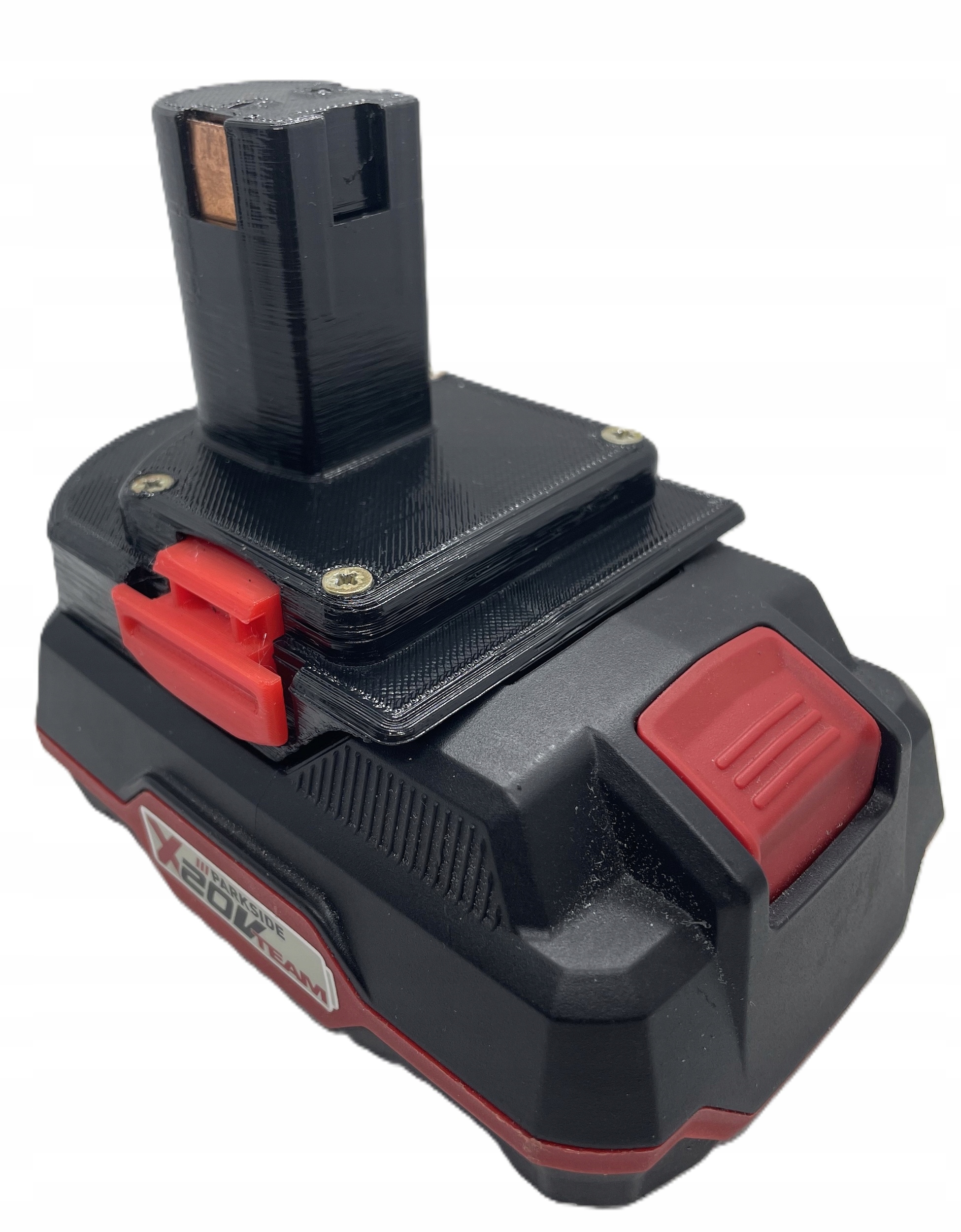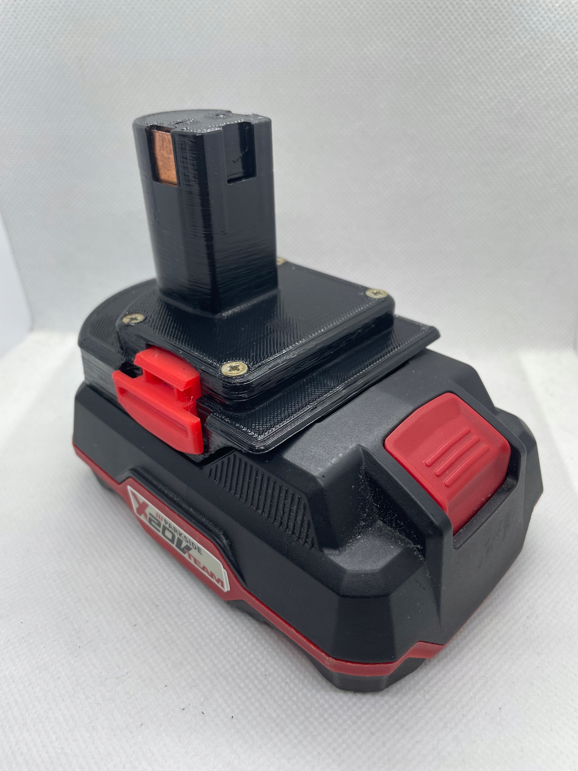Przedmiotem aukcji jest przejściówka tanich i bardzo popularnych baterii firmy Parkside do elektronarzędzi Ryobi One+ .
