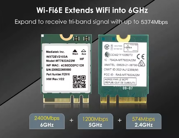Szybkość transmisji Wi-Fi: 2,4 GHz–574 Mb/s (80 MHz), 5 GHz–2400 Mb/s (160 MHz), 6 GHz–2400 Mb/s (160 MHz)