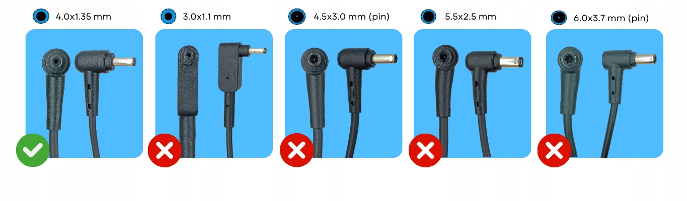✅ kształt i wielkość wtyku – prosimy porównać ze zdjęciem oferowanego przedmiotu oraz z wymiarami wtyku podanymi w opisie. Wybór nieprawidłowego wtyku to najczęstsza pomyłka przy wyborze zasilacza. W razie wątpliwości prosimy o przesłanie do nas modelu posiadanego laptopa, a my wskażemy właściwy zasilacz.