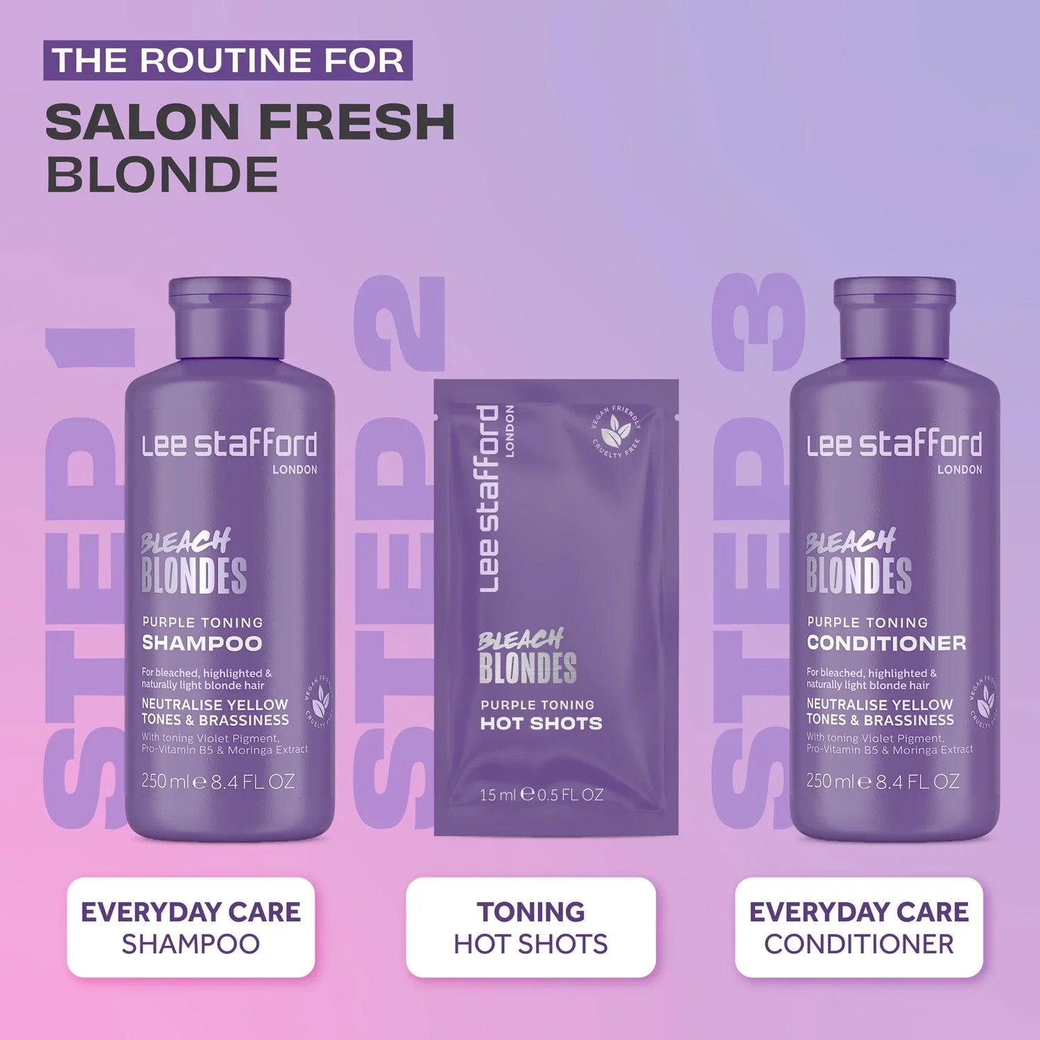 ➡️Bleach Blondes Purple Toning hot shots to intensywne saszetki stworzone specjalnie dla blondynek, które pragną utrzymać zimne, pozbawione żółtych tonów pasma. Dzięki zaawansowanej formule, każda aplikacja dostarcza nie tylko intensywnego działania przeciwdziałającego żółknięciu, ale także odżywienia i blasku.