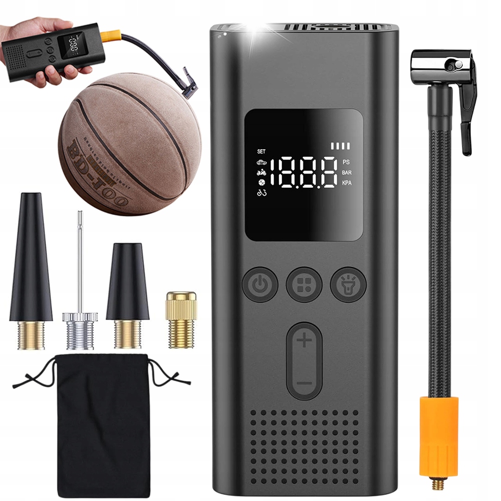 To przenośna elektryczna pompa, kompaktowa i lekka, z pokrowcem do przechowywania. W zestawie znajdują się dysze amerykańskie, francuskie oraz igła do piłek, idealne do samochodów, rowerów, motocykli, piłek nożnych/koszykówki! 🚗🚴⚽