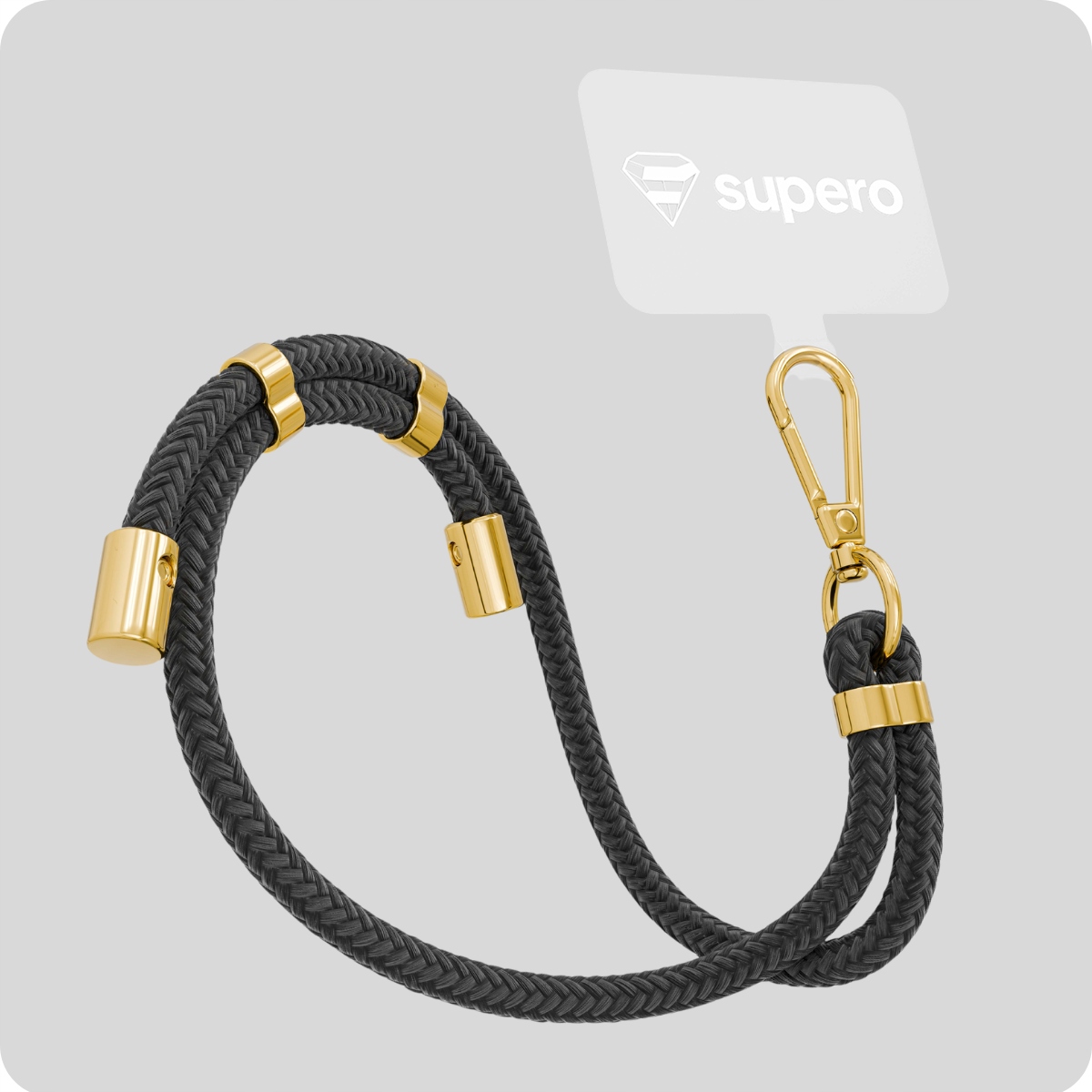 Eleganckie detale – czarny, elastyczny sznur wykończony złotymi tulejkami oraz solidnym karabińczykiem w kształcie łezki. Powiększone fragmenty ukazują precyzyjne łączenia i połyskujące złote elementy, które nadają całości stylowego charakteru.
