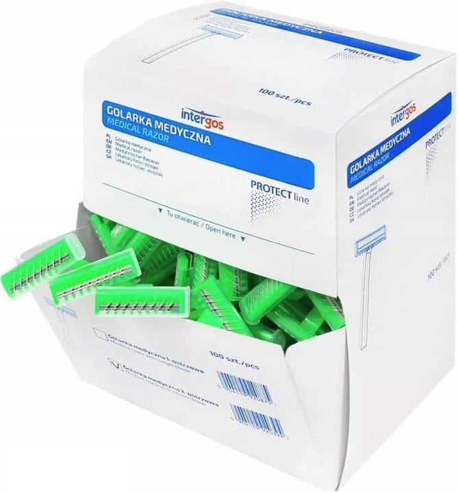Cechy produktu: niesterylny, jednorazowego użytku, wyposażony w podówjne ostrze, lekki, bezpieczny, obudowa plastikowa, z nasadą chroniącą ostrze, do usuwania owłosienia przed zabiegami, uniwersalne zastosowanie, 100 sztuk w opakowaniu, umieszczone w poręcznym dyspenserze.