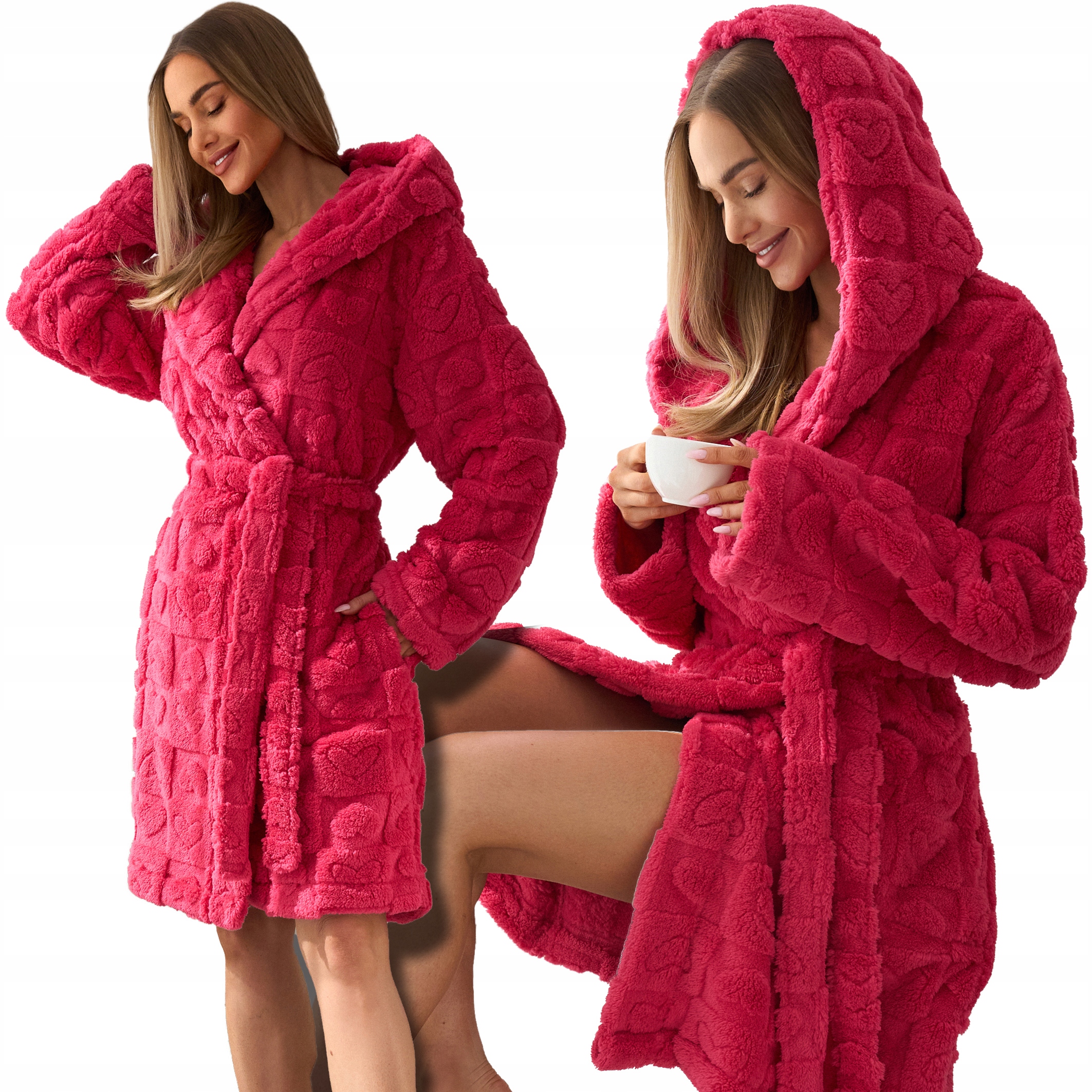 Otul się niezrównanym komfortem i ciepłem ekskluzywnego pluszowego szlafroka damskiego z kapturem. Ten miękki i puszysty szlafrok to kwintesencja domowego relaksu i luksusu, na który zasługujesz każdego dnia. Jego delikatna, tłoczona faktura w kształcie serc dodaje mu unikalnego charakteru i subtelnej elegancji.