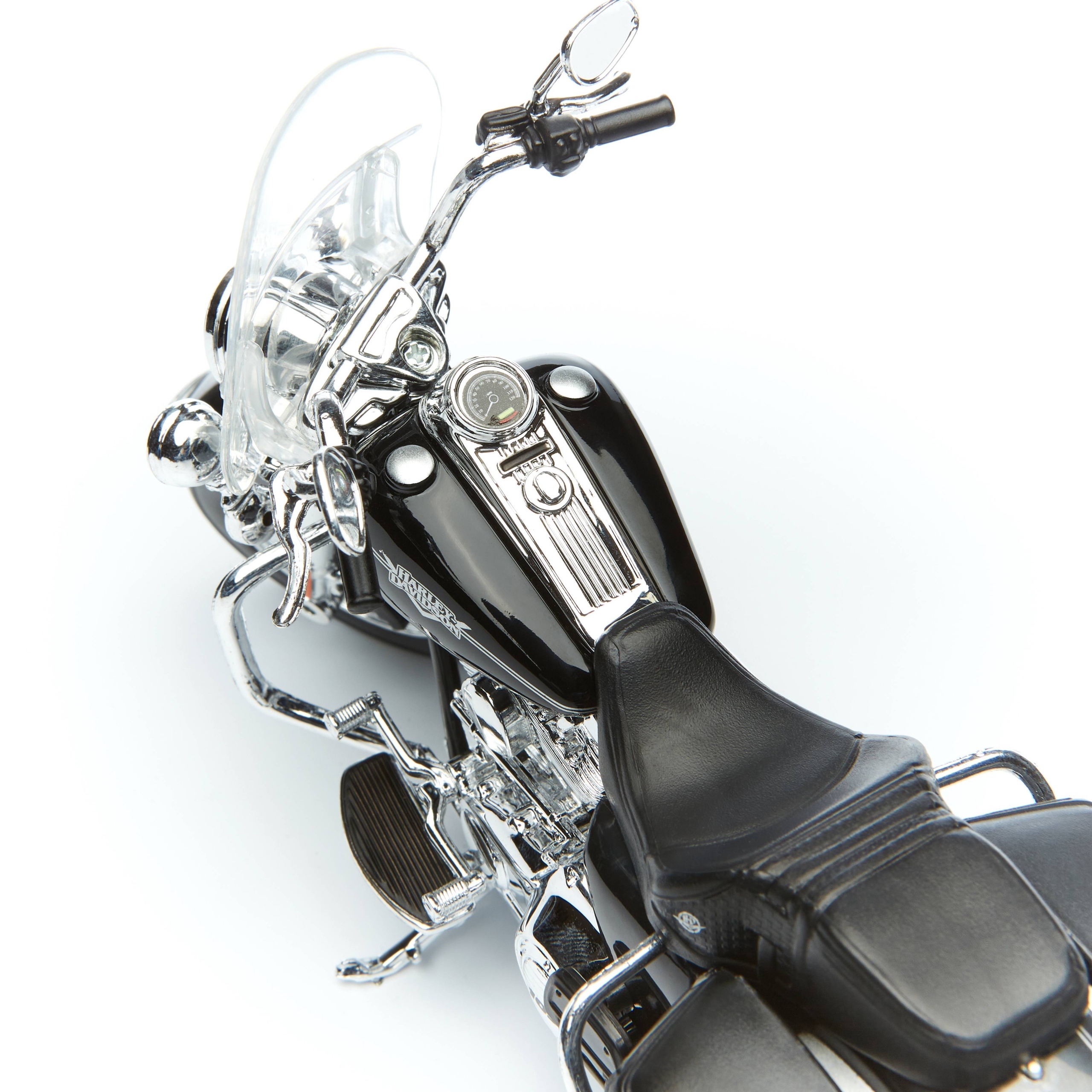 Motocykl na licencji Harley Davidson w skali 1:12. Seria motocykli Harley-Davidson charakteryzuje się ruchomymi elementami oraz dbałością o każdy szczegół. Model jest dokładnym odwzorowaniem w skali prawdziwego motocykla. Posiada wysuwaną nóżkę, dzięki czemu wspaniale prezentuje się na biurku lub półce kolekcjonera. Wiek: 8+. Wymiary opakowania: szer. 22 cm, wys. 12,5 cm, gł. 8,5 cm. Szt/karton: 12.
