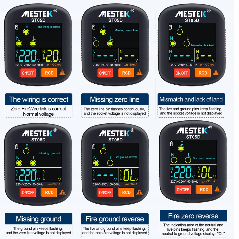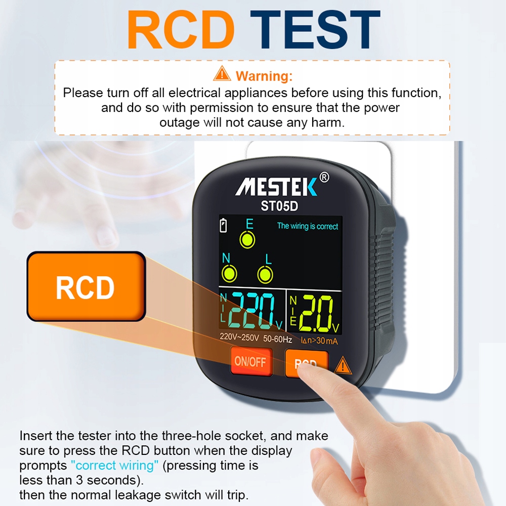 4. Test RCD: Przed użyciem tej funkcji należy wyłączyć wszystkie urządzenia elektryczne. Następnie możesz wstawić tester do gniazda i upewnij się, że naciśnij przycisk RCD, gdy wyświetlacz wyświetla monit \ "poprawne okablowanie \" (czas naciśnięcia wynosi \ u003c3 sekundy). Następnie wyruszy normalny przełącznik upływu.