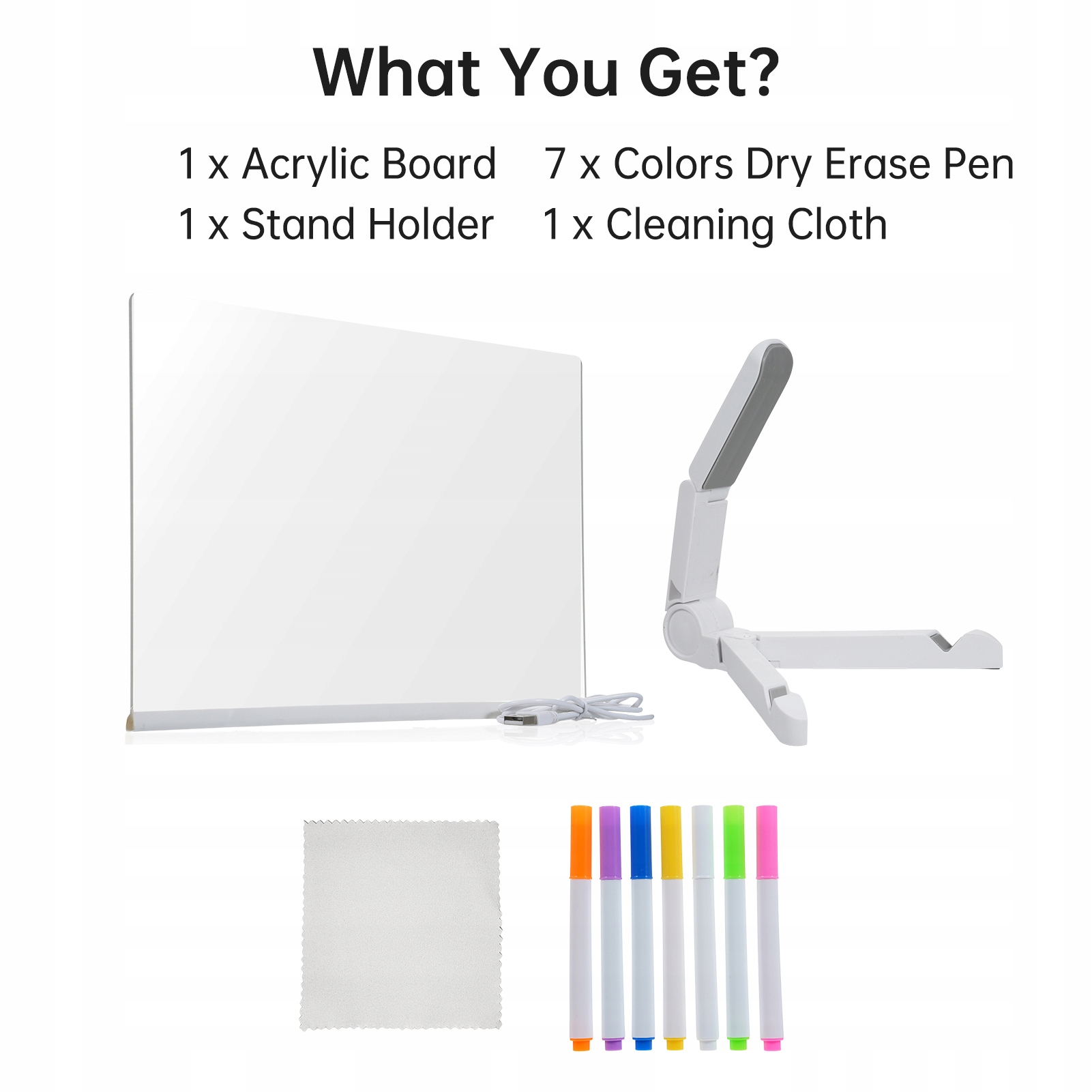 4. 【W zestawie kolorowe długopisy i stojak】 Każda płyta do pisania LED jest wyposażona w 7 kolorów suchy długopis, umożliwiając tworzenie żywych i kolorowych rysunków lub notatek. Obejmuje również stojak, co ułatwia wyświetlanie na biurku lub stole.