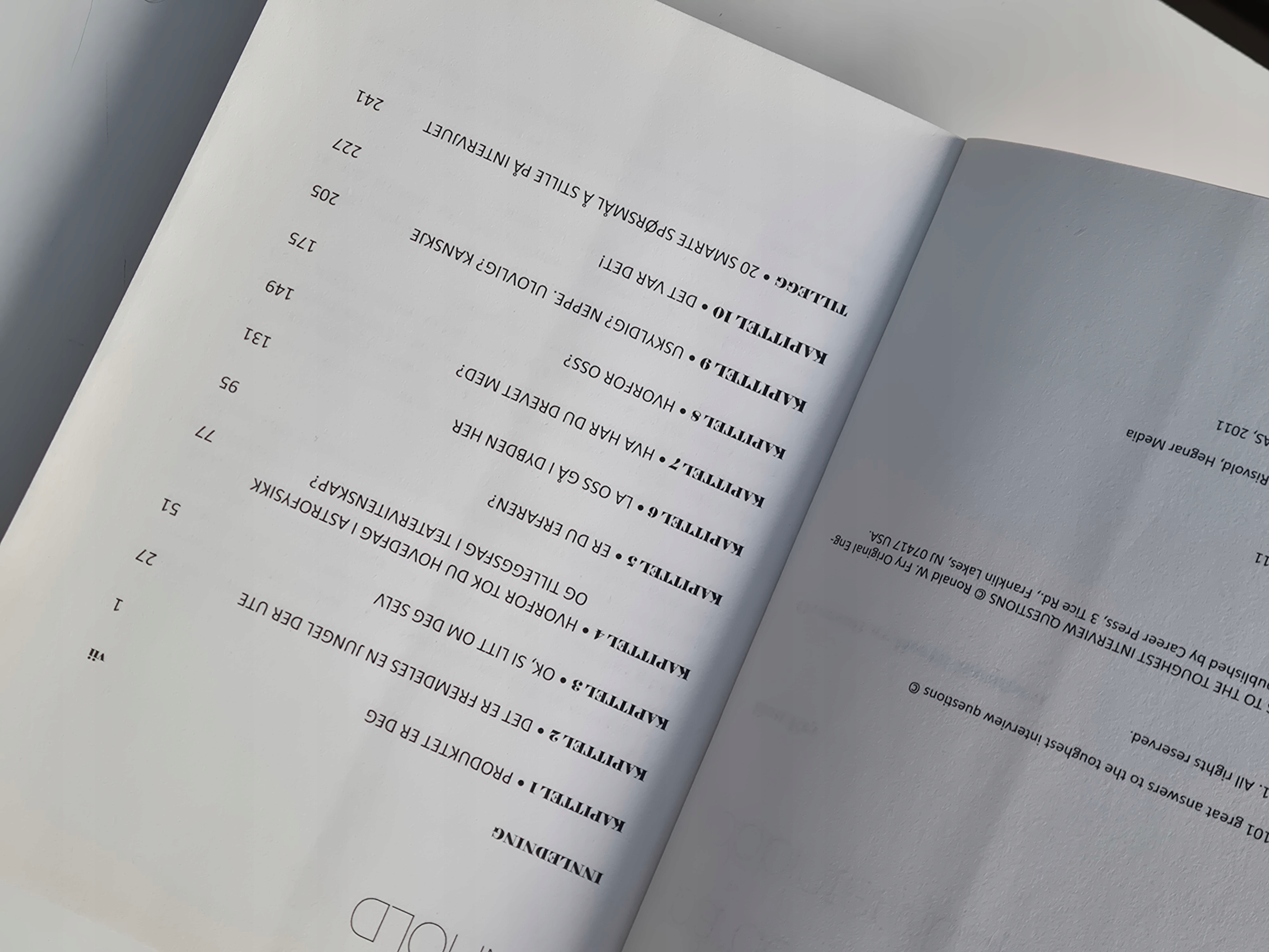 101 doskonałych odpowiedzi na najtrudniejsze pytania w rozmowie rekrutacyjnej...Norweski poradnik o tym jak poradzić sobie na rozmowie kwalifikacyjnej. Publikacja stanowi swoisty poradnik również o tym jak budować odpowiedzi, czego nie mówić, jakich tematów unikać, lub gdy się pojawiają jak z nich wybrnąć. 101 perfekte svar... to także zestaw schematów opisowych np. w jaki sposób przedstawić listę referencyjną swoich poprzednich pracodawców. Książka może być traktowana jako materiał pomocniczy w nauce języka norweskiego (poziom umiejętności oceniam na B2 / C1), zwłaszcza dla osób zamierzających szukać zatrudnienia w Norwegii, jak również zatrudnionych w działach HRowych norweskich przedsiębiorstw.