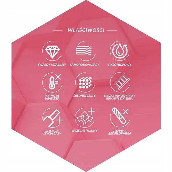 Twardy i stabilny – dzięki niskiemu poziomowi elastyczności idealnie sprawdza się w budowie stabilnego szkieletu oraz przedłużaniu na szablonie lub dual formach. Jest również doskonałym wyborem do uzupełnień i wzmocnienia naturalnej płytki.