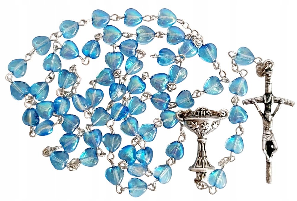 Różaniec wykonany jest z koralików kryształkowych w kształcie serduszek w kolorze niebieskim. Wspaniale mieni się zarówno w świetle dziennym jak i sztucznym.