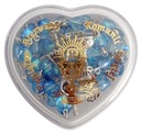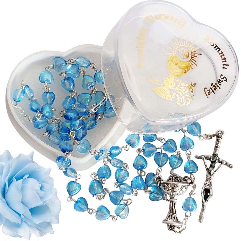 PIĘKNY RÓŻANIEC KOMUNIJNY WYKONANY Z SERDUSZEK KRYSZTAŁKOWYCH NIEBIESKICH W OZDOBNYM PUDEŁECZKU W KSZTAŁCIE SERCA
