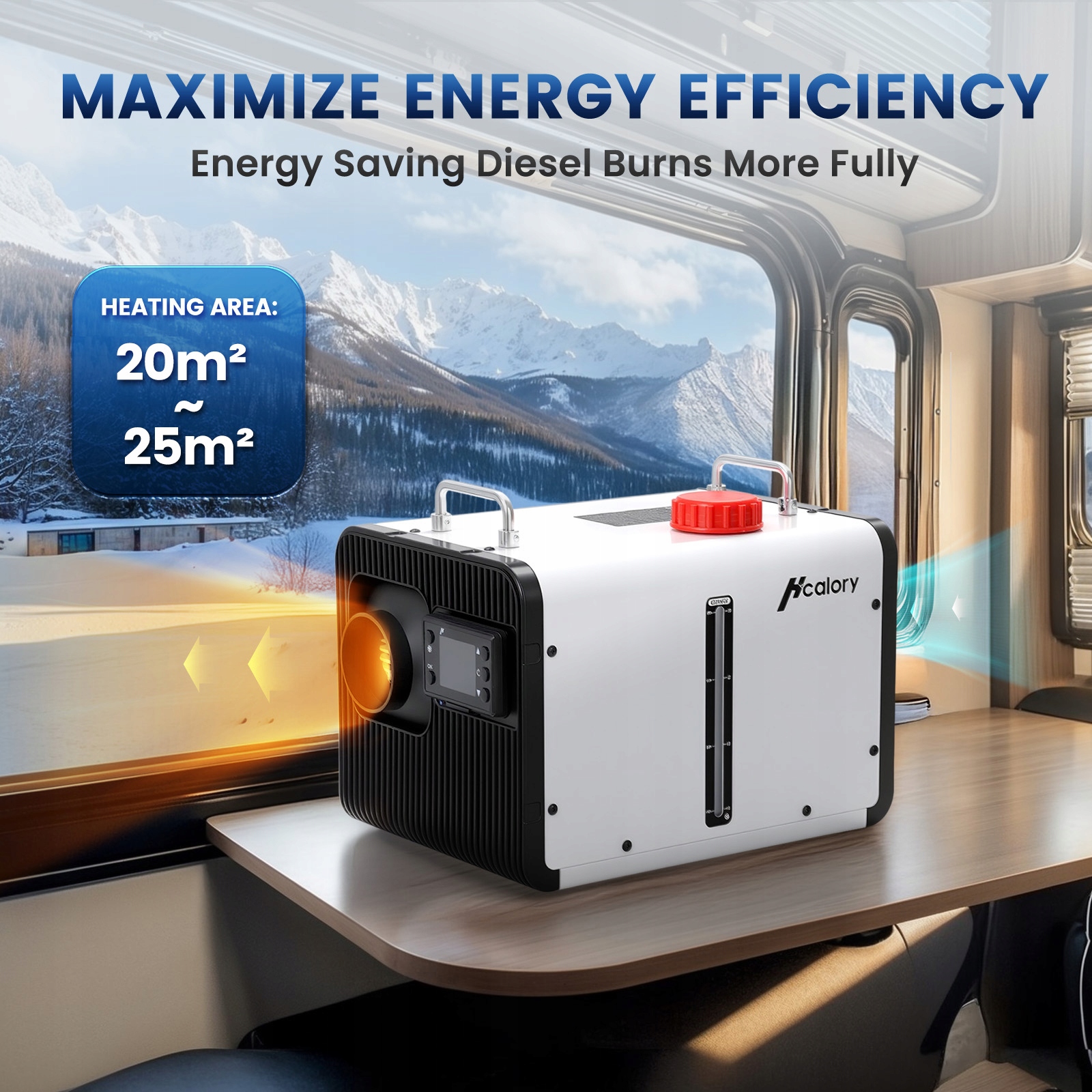 Energooszczędność: Nagrzewnica HCALORY 8 kW z silnikiem wysokoprężnym, zmodernizowana w 2025 roku, zapewnia 18% wzrost efektywności ogrzewania i 18% oszczędności paliwa, zapewniając stałe i rozległe ciepło w pomieszczeniach o powierzchni do 269 stóp kwadratowych (ok. 26 m²). Osiąga temperaturę 50°C (122°F) w zaledwie 3 minuty, zapewniając komfortową i przytulną temperaturę w pojeździe lub kabinie jachtu. Przenośna nagrzewnica powietrza 8 kW z silnikiem wysokoprężnym 12 V