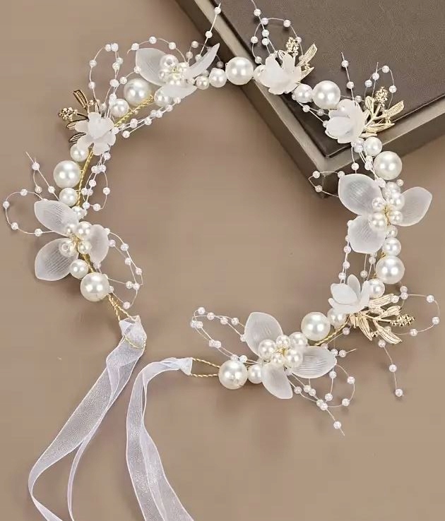 Rustykalny wianek dekorowany jest kwiatkami w białym kolorze, zakończony ozdobną satynową kokardą. Wianek ozdabiają perełki przeplatane złotymi akcentami.