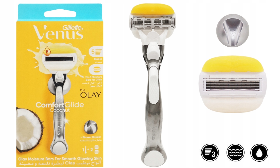 Golenie nigdy nie było łatwiejsze. Maszynka do golenia dla kobiet Venus Comfortglide Coconut plus Olay ma 5 ostrzy, które zapewniają gładkie i dokładne golenie na dłużej. Wymienne głowice Gillette Venus ComfortGlide Olay pozwalają na komfortowe golenie bez konieczności stosowania żelu do golenia. Łatwe golenie zapewnia 5 ostrych ostrzy wraz z elastycznymi taśmami nawilżającymi, które po kontakcie z wodą uwalniają pielęgnujący balsam do ciała, ułatwiający przesuwanie się maszynki po skórze.
